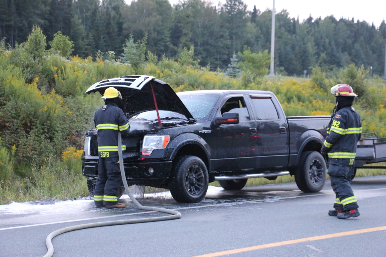 Par ailleurs, à peu près au moment, le feu s'est déclaré dans le moteur d'une camionnette qui circulait sur la route du Parc industriel à Beauceville, près de l'Autoroute 73.