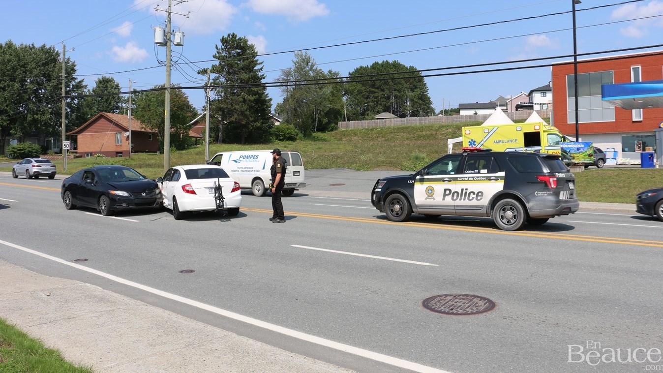 Une collision est survenue vers 14 h entre deux véhicules en face de la pharmacie Uniprix, au 14650 sur le boulevard Lacroix, à Saint-Georges.