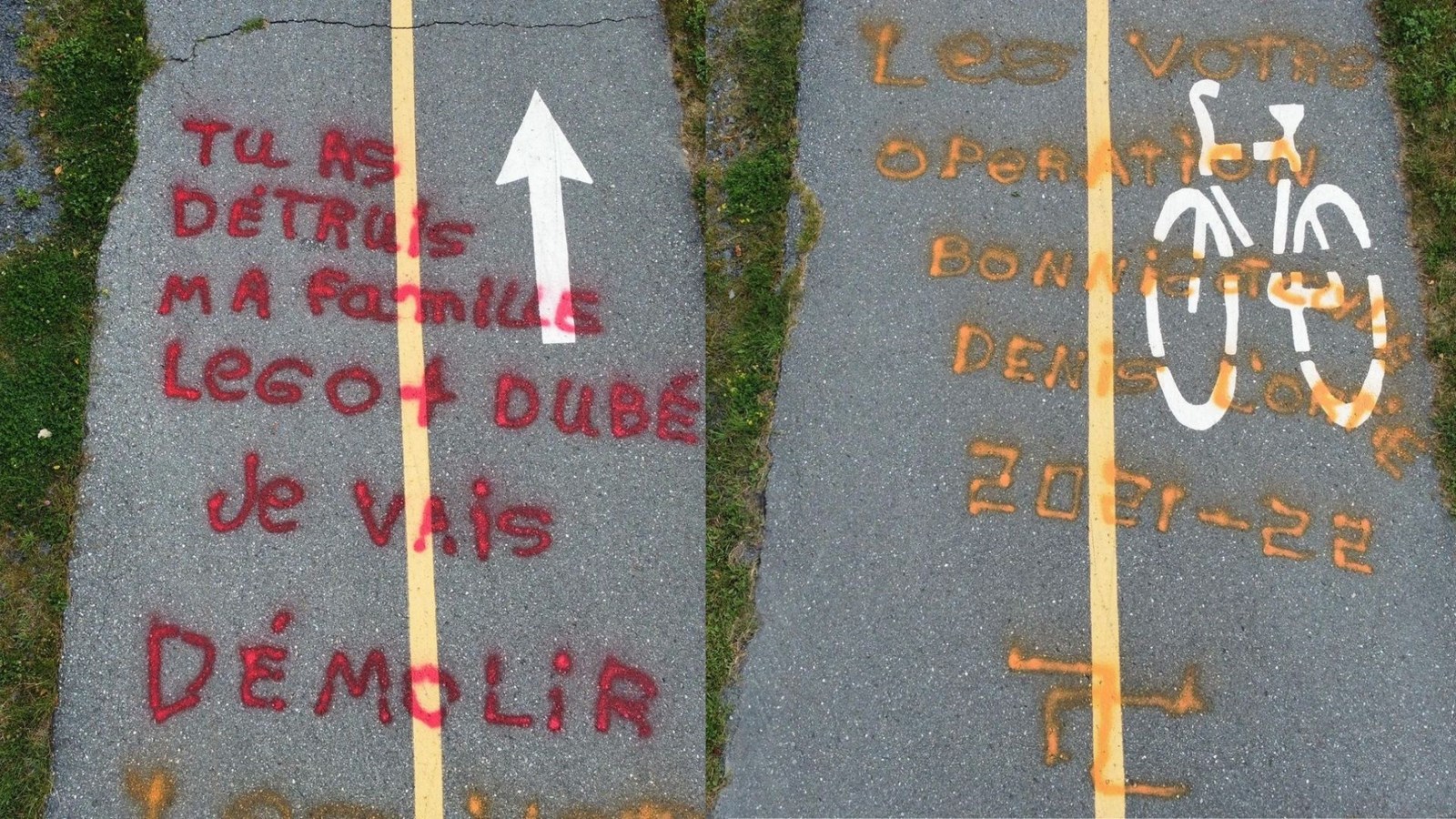 Un autre graffiti proférant des menaces envers le premier ministre du Québec, François Legault, et du ministre de la Santé et des Services sociaux, Christian Dubé, a été découvert ce matin sur la piste cyclable à Notre-Dame-des-Pins, au niveau de l'intersection entre la 30e Rue et le chemin Royal.