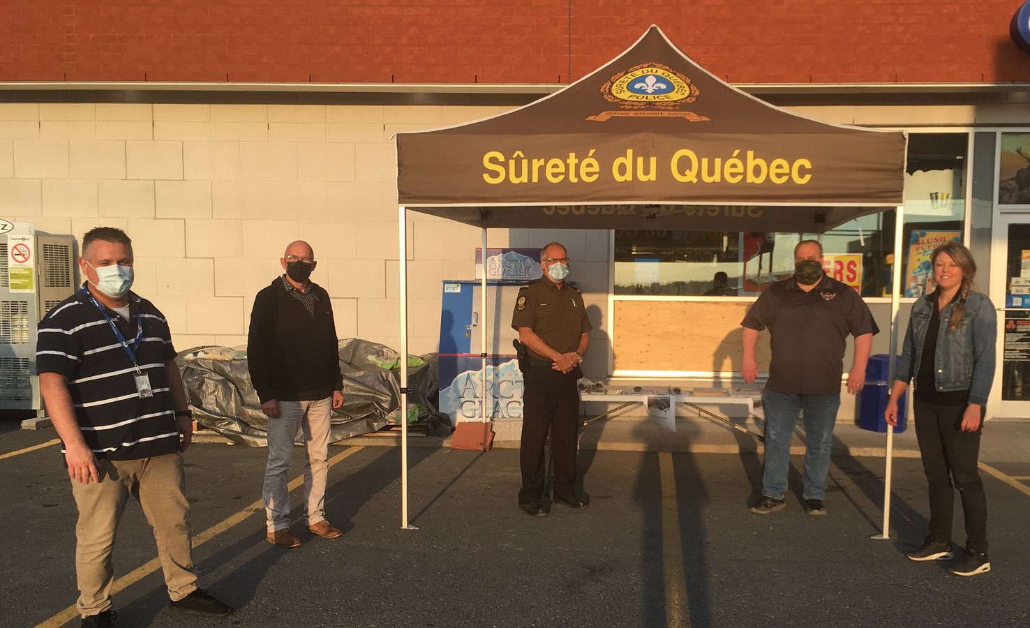 Sur la photo de groupe, de gauche à droite : Maxime Poulin, intervenant du CLSC, Daniel Veilleux, intervenant Partage au masculin, le sergent Mario Thiboutot, Éric Bolduc, gérant de la boutique et Marie-Josée Plante, propriétaire.