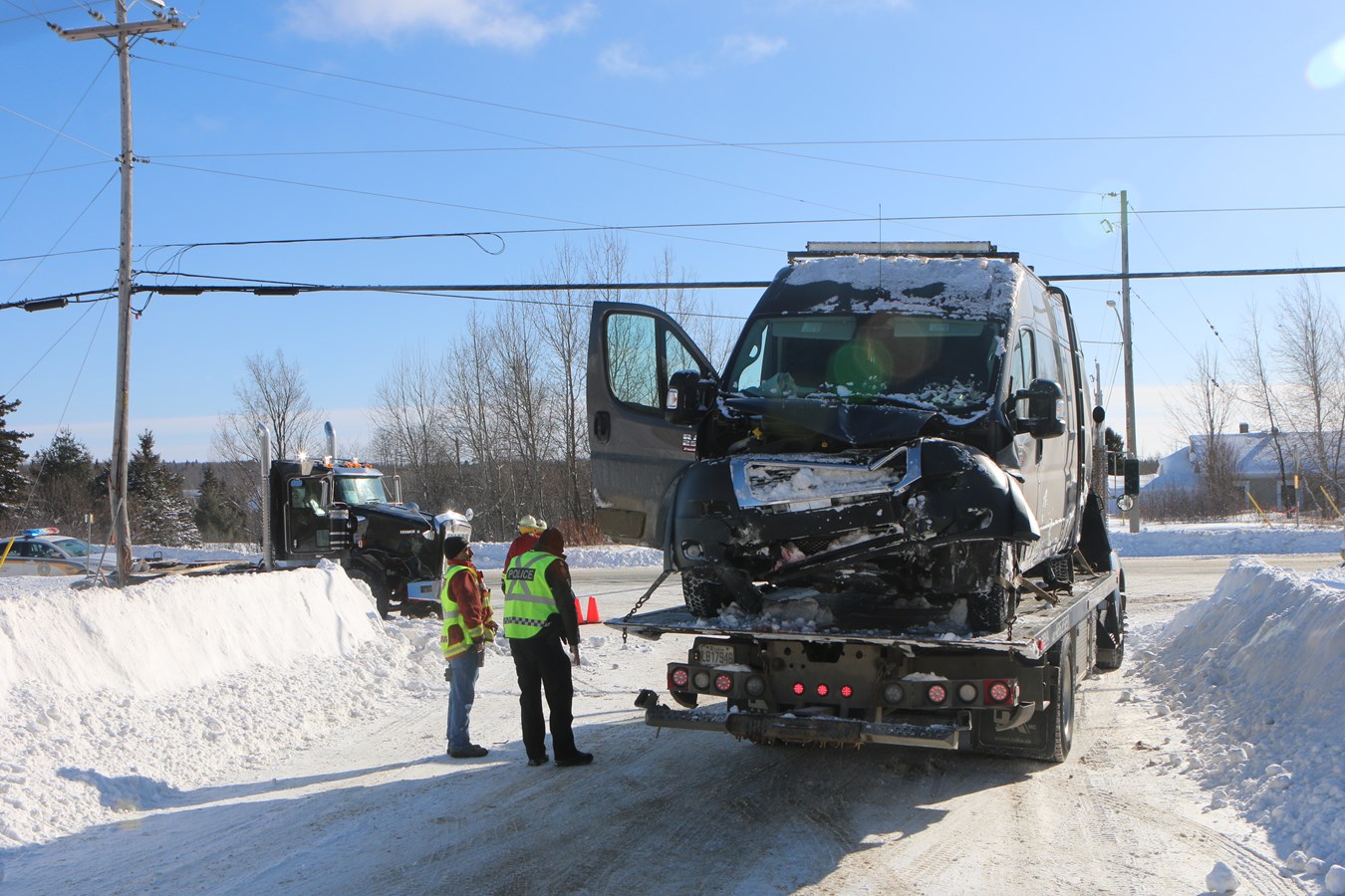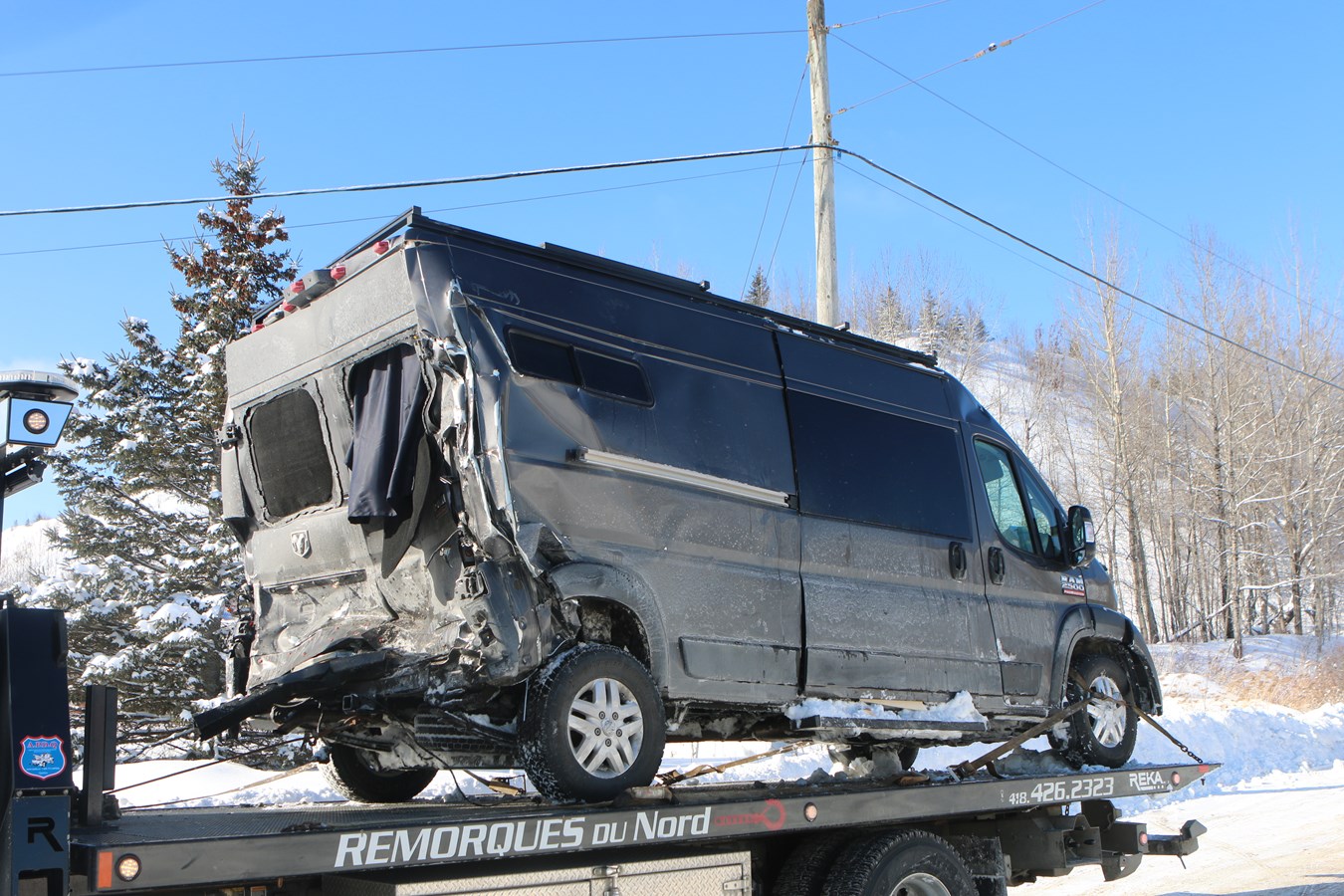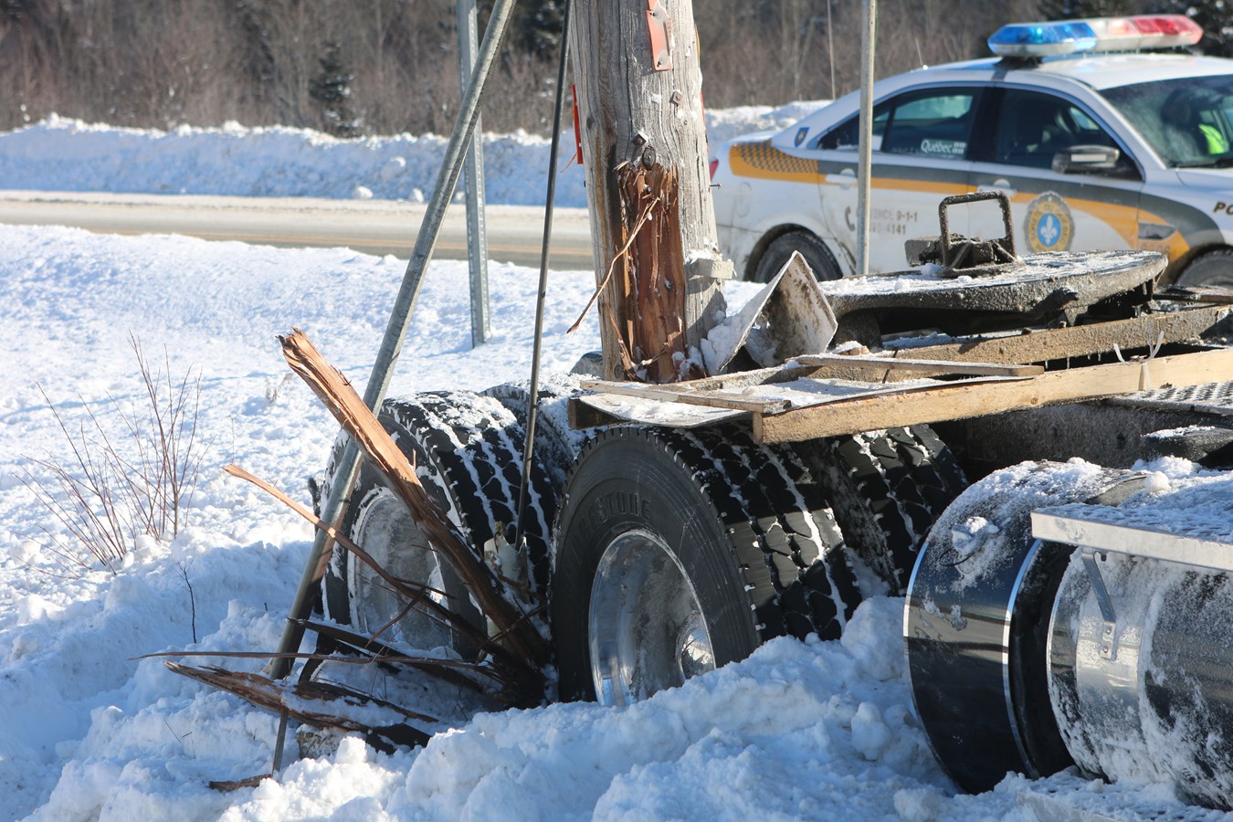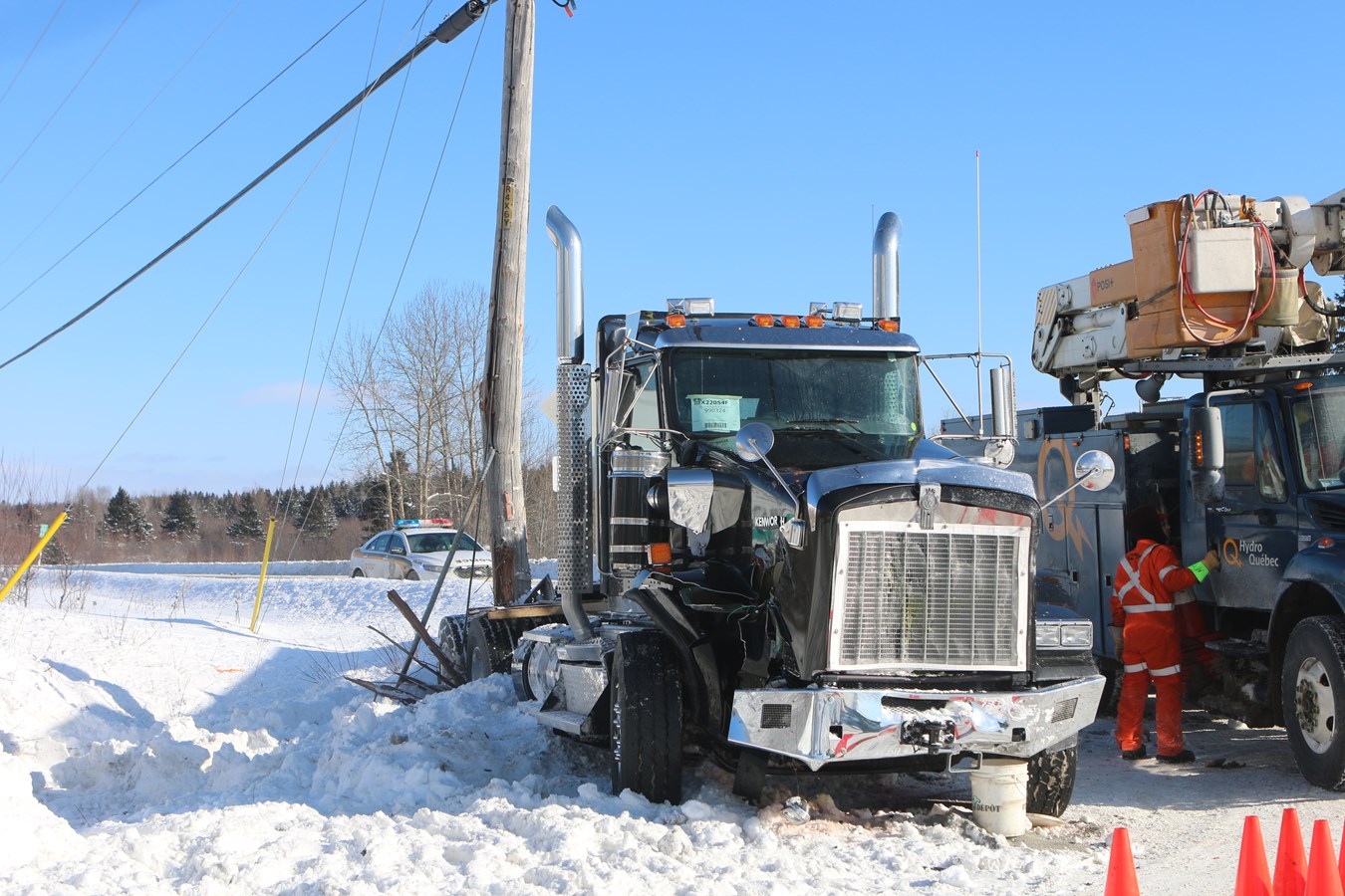 Un poids lourd, sans remorque, n'a pas réussi à s'immobiliser et a percuté l'arrière d'une van qui était arrêtée pour effectuer un virage sur le 3e rang Nord. Le camion s'est alors encastré dans un poteau d'Hydro Québec situé dans cette intersection.
