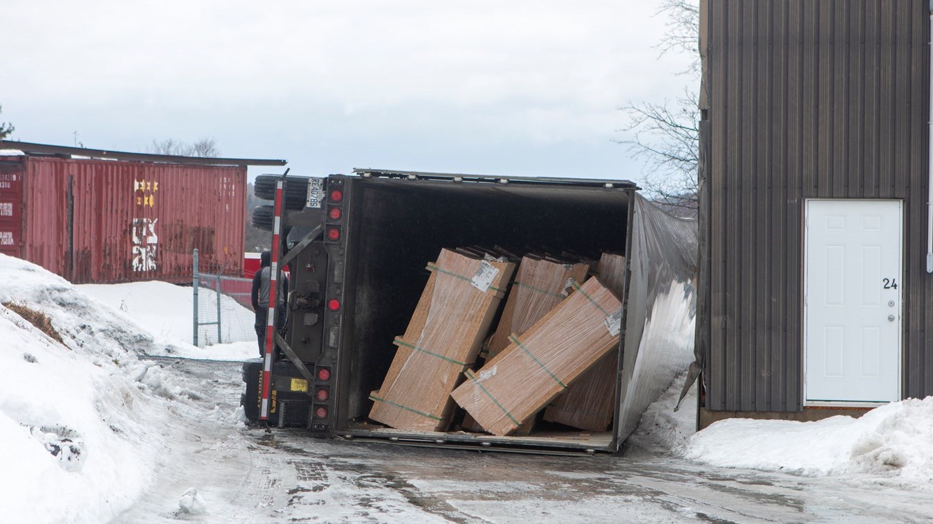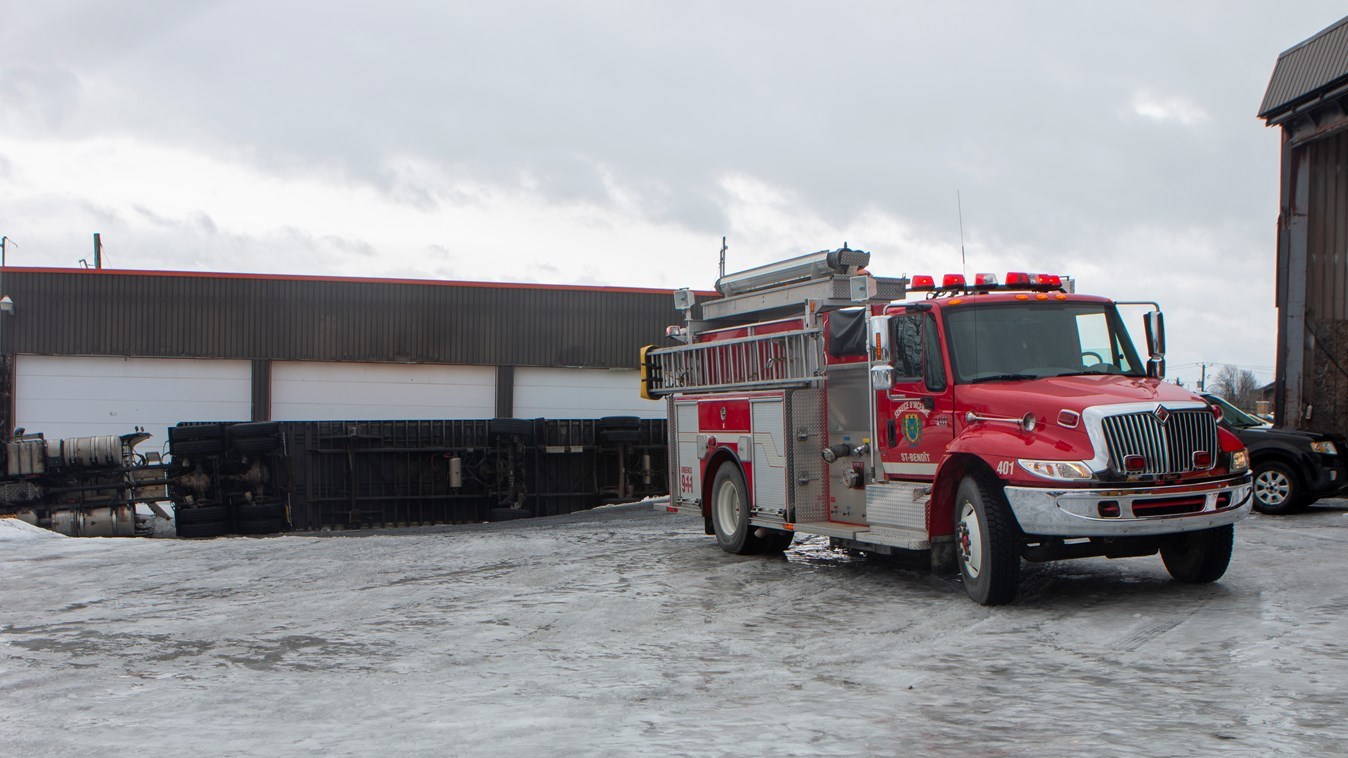 Un camion de type 53 pieds s’est renversé dans la cour de l’entreprise Meubles villageois, située sur la rue du Villageois à Saint-Benoît-Labre.