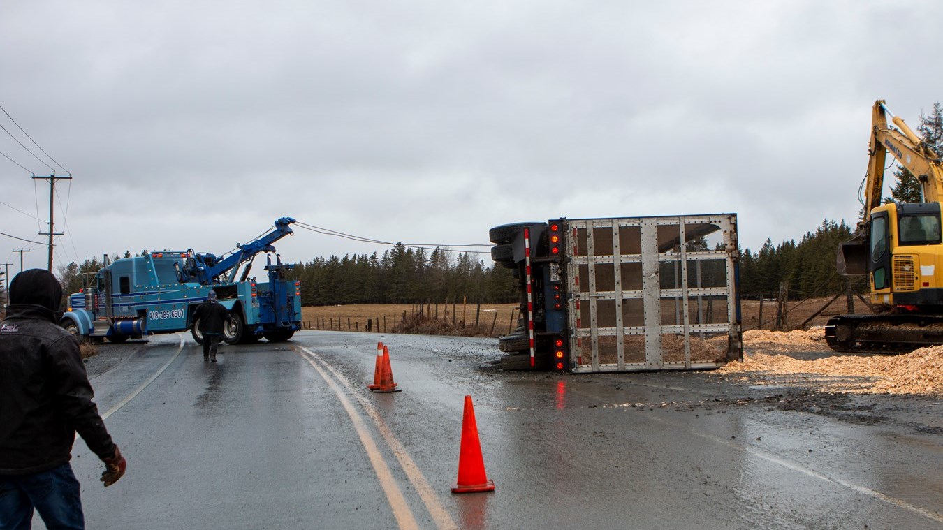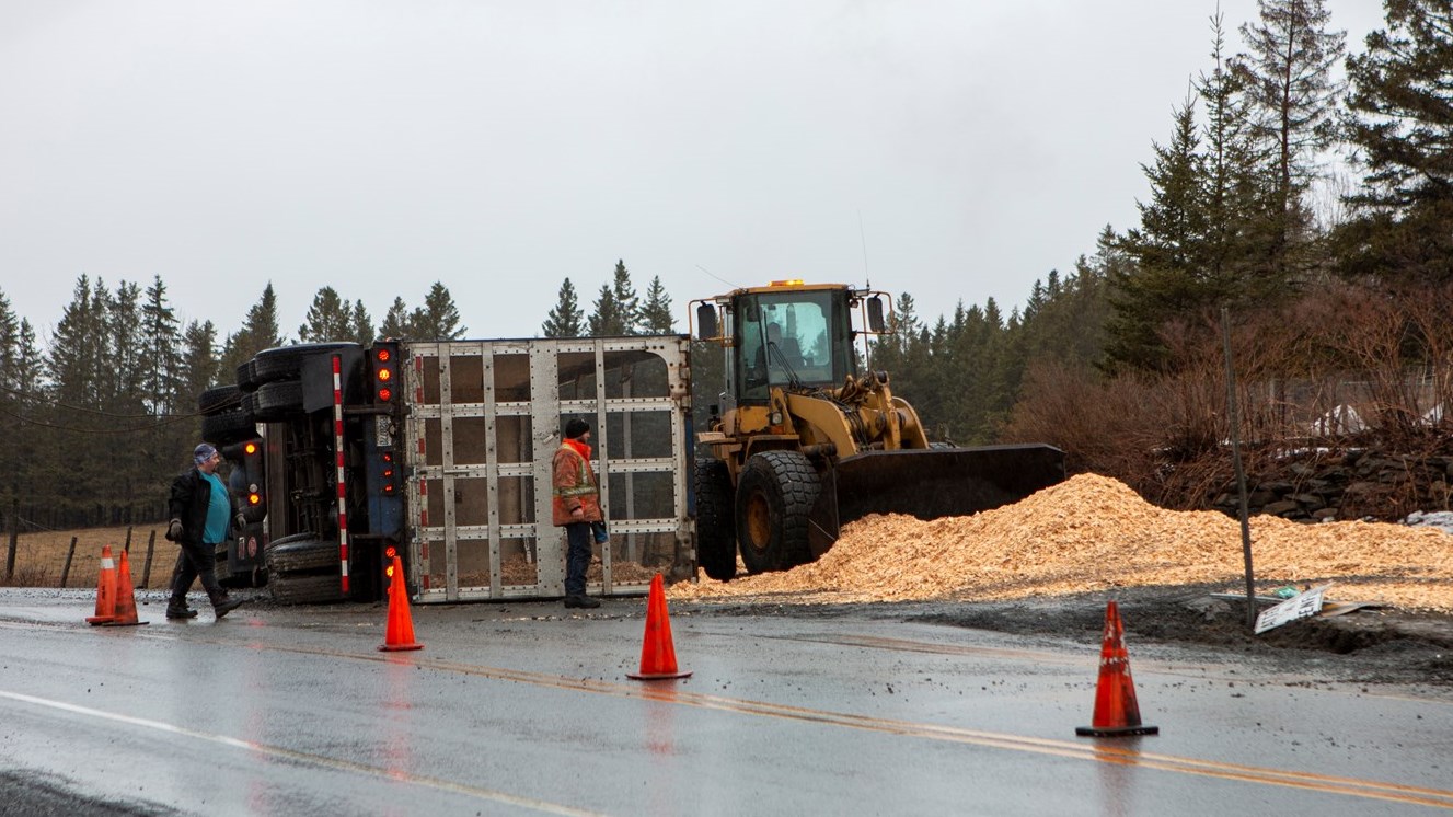 Vers 10 h, hier matin, à Saint-Prosper un véhicule lourd s’est renversé sur le côté sur la chaussée.