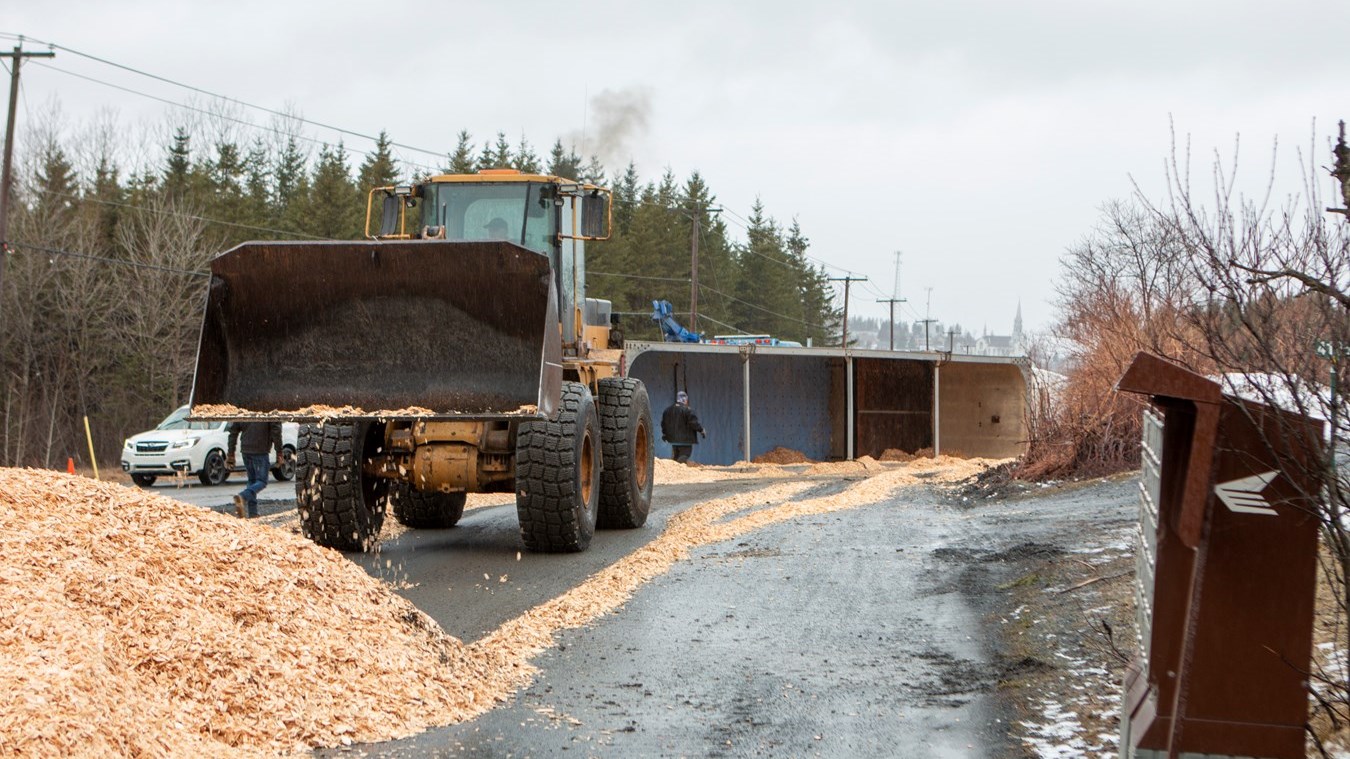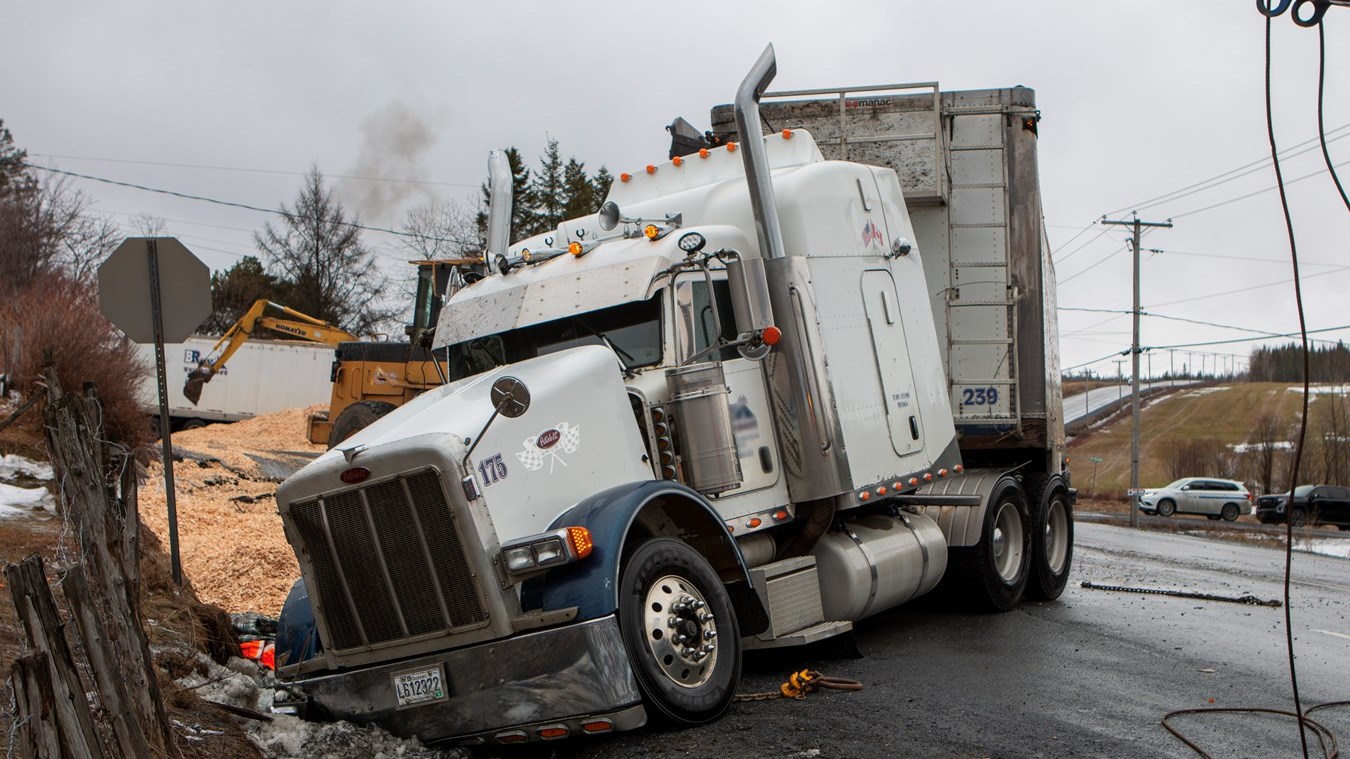 Le 53 pieds transportant des copeaux de bois a basculé en prenant une courbe au coin de la 24e avenue et la 40e rue. Heureusement, le conducteur n’a pas été blessé.