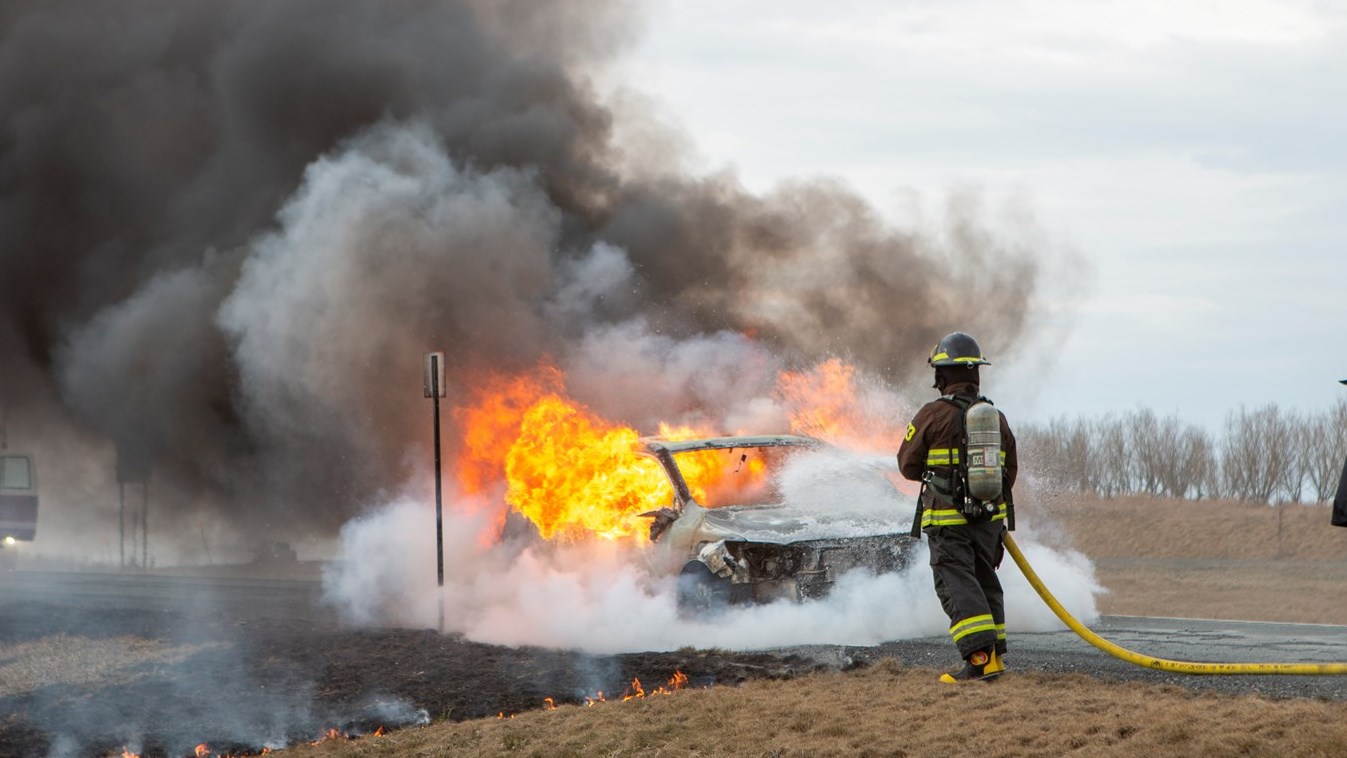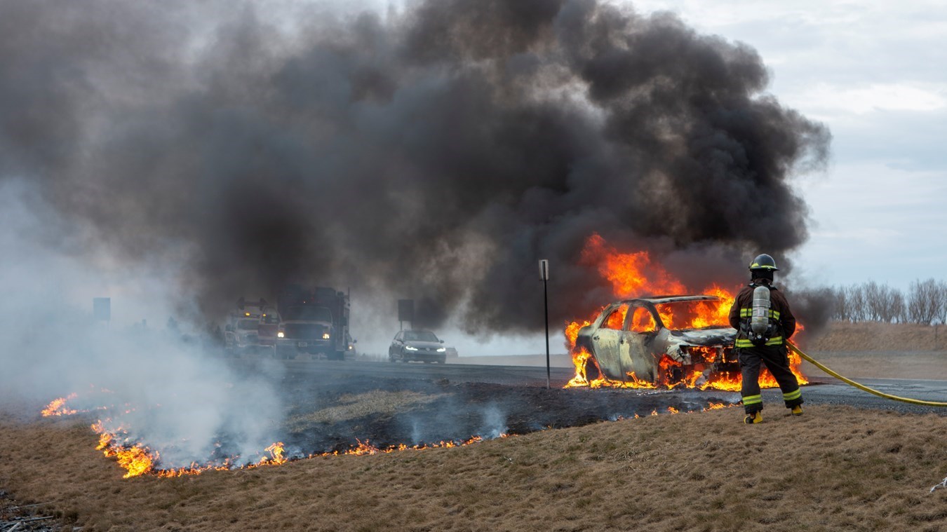 Selon nos informations, l’incendie aurait débuté sous le véhicule et c’est un autre conducteur qui a avisé la conductrice que la voiture avait commencé à s’enflammer.