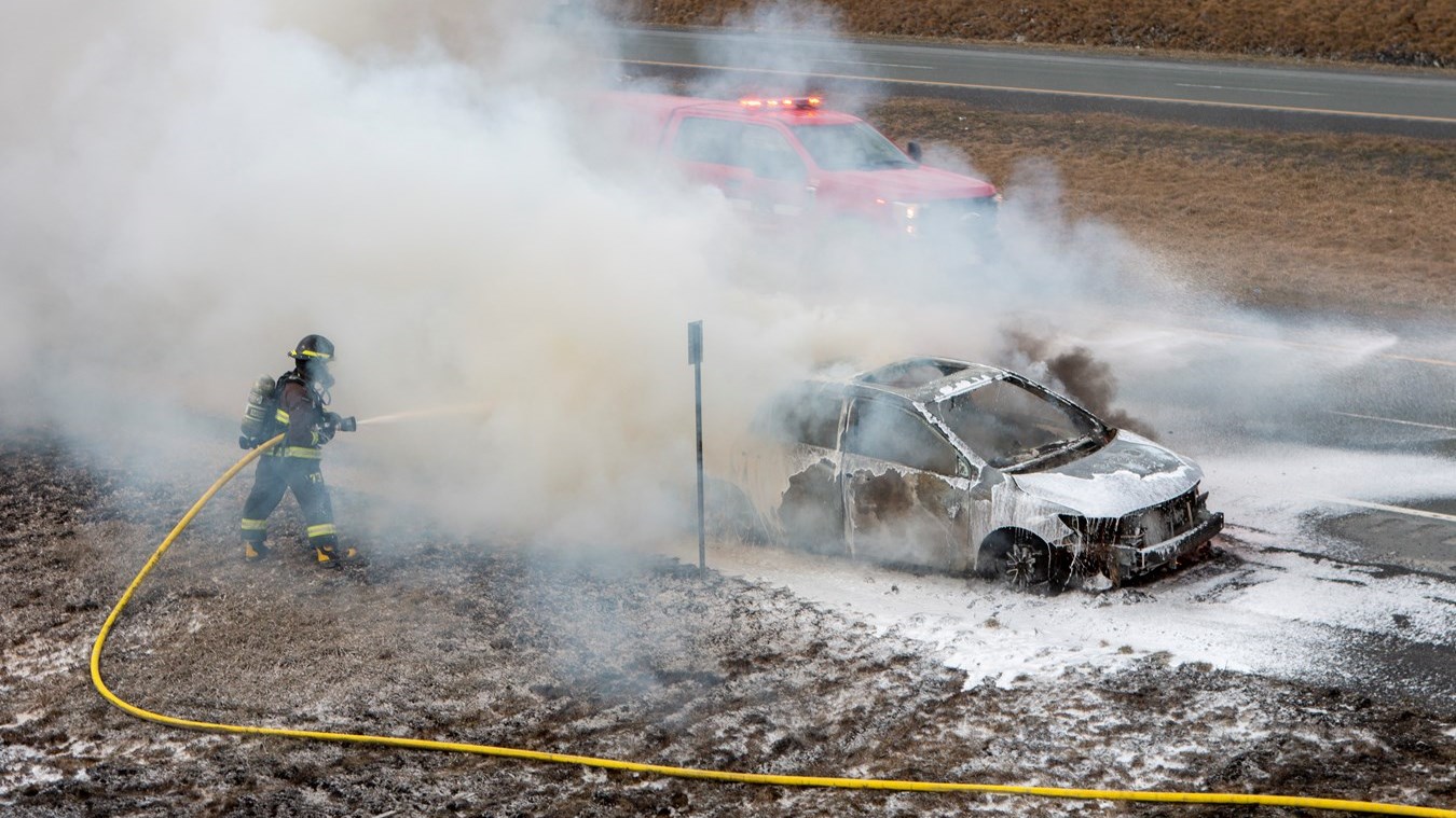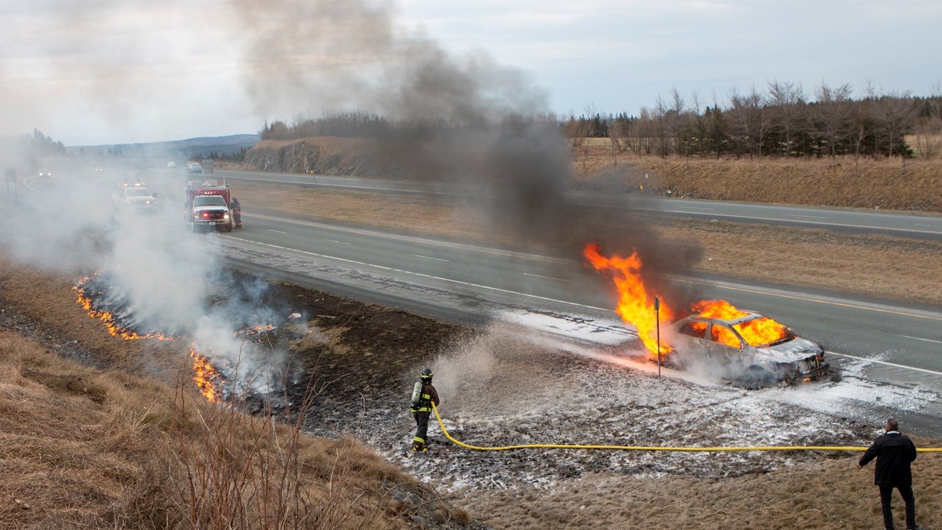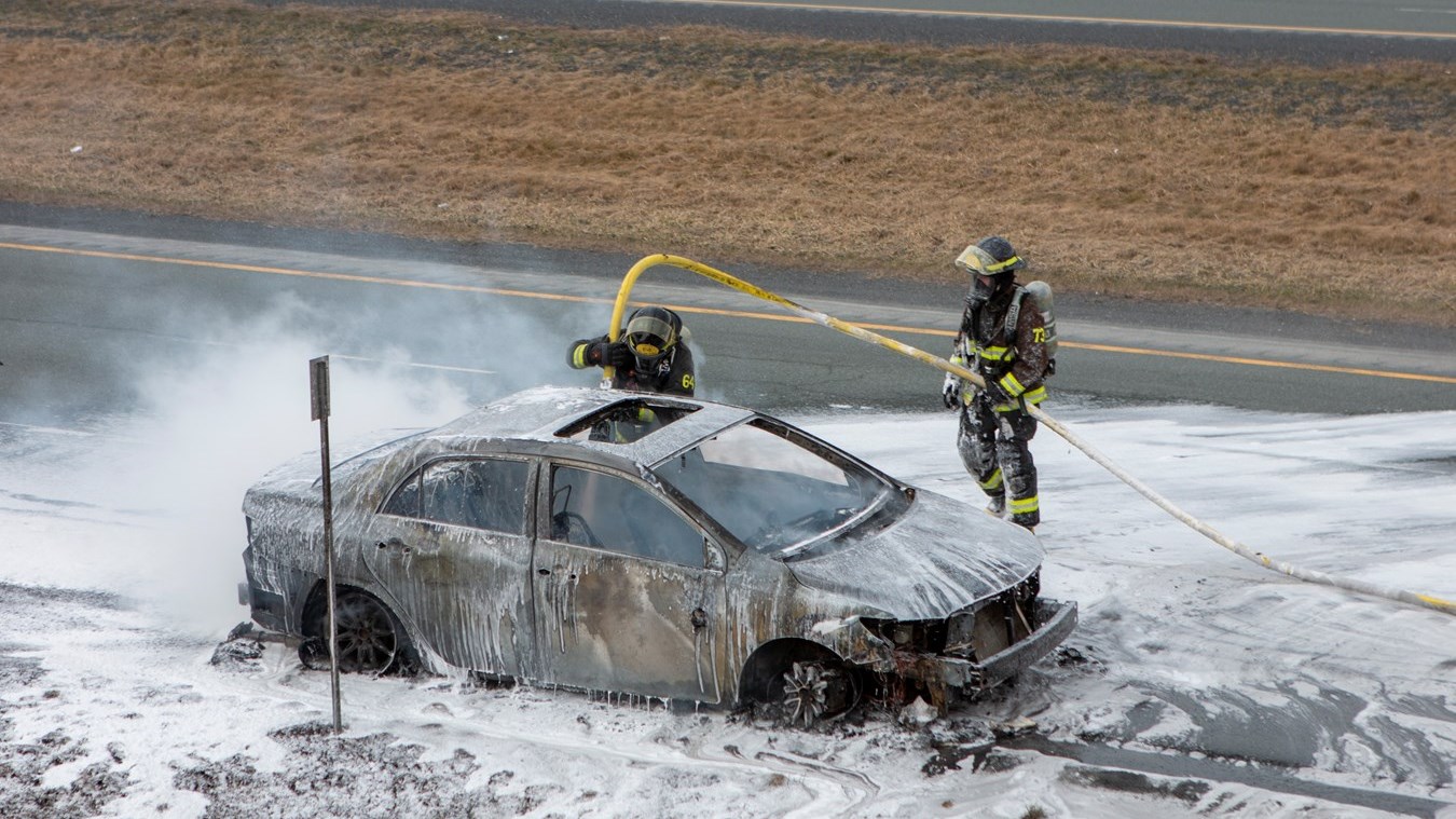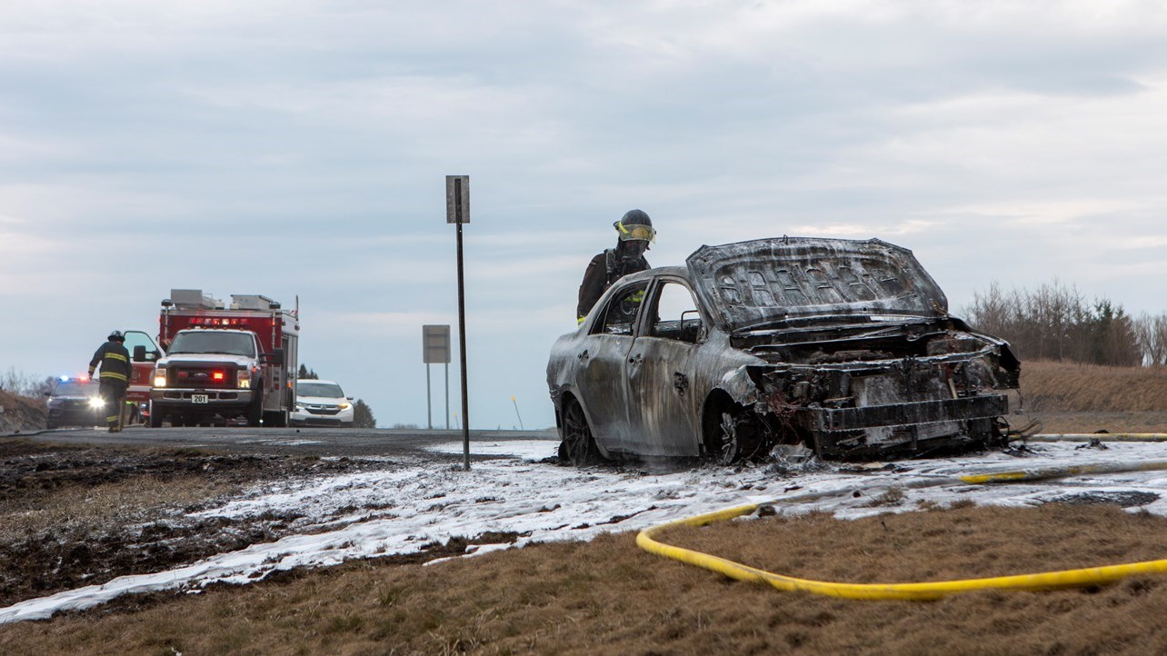 L’automobile est une perte totale, mais la conductrice s’en est sorti indemne et n’a pas été incommodée par la fumée. La cause plausible de l’incident serait de nature mécanique.