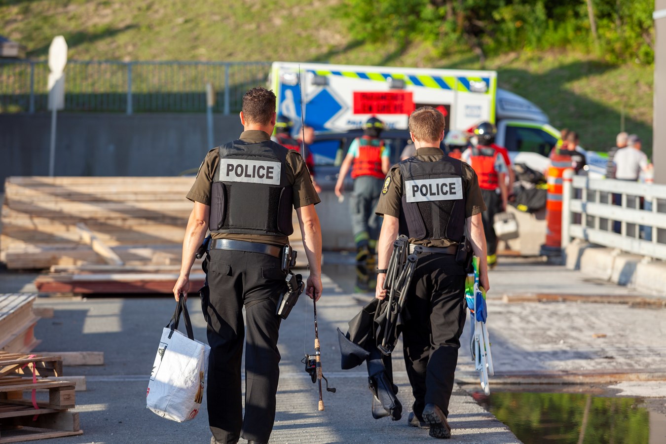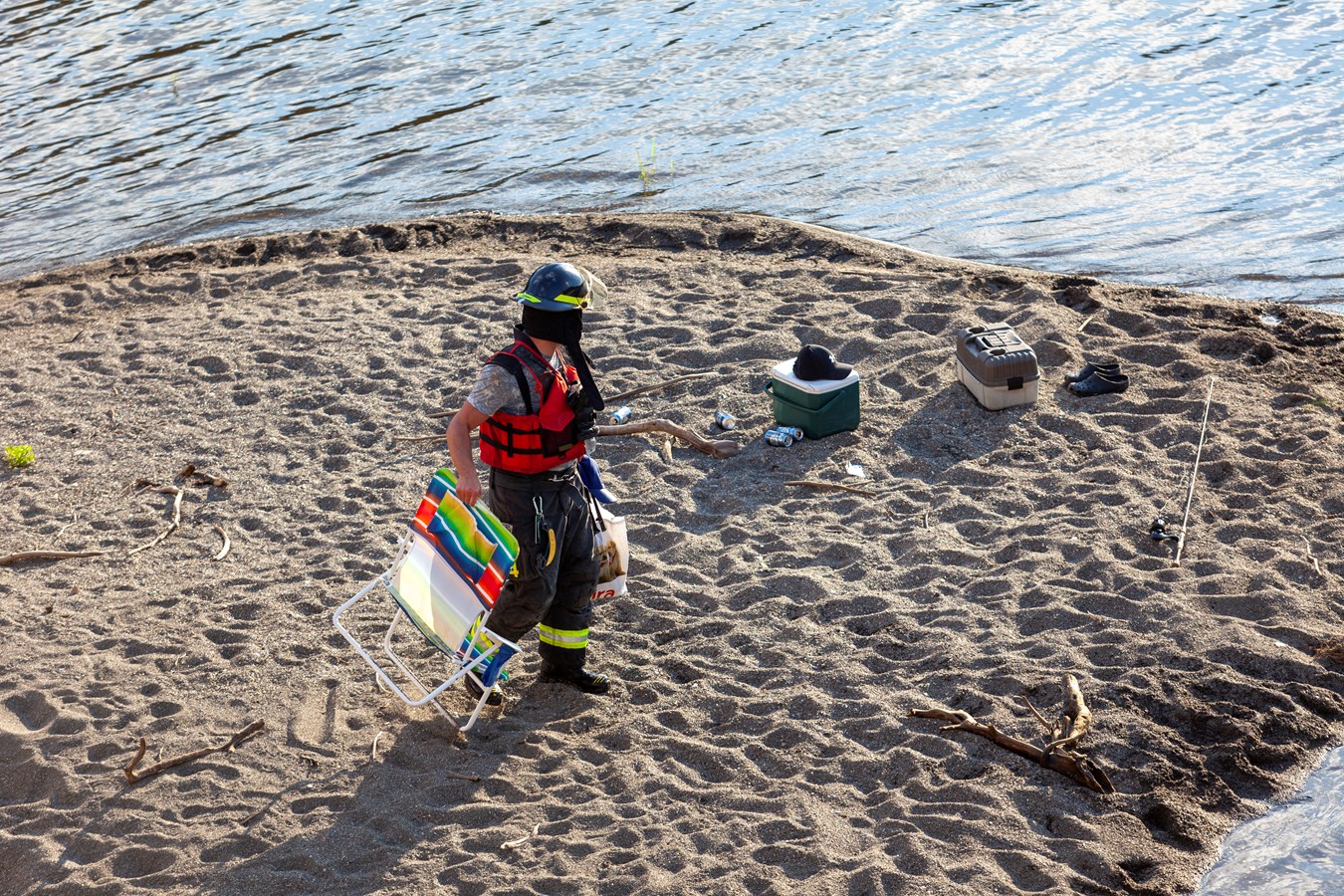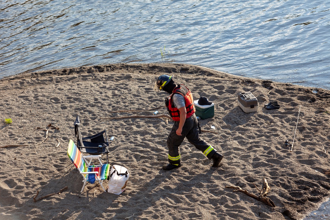 À leur arrivée, ils ont découvert un homme de 51 ans et une femme de 24 ans, en maillot de bain, installés sur un petit îlot de sable de la rivière Chaudière, au pied du barrage, avec chaises de plage, glacière et équipement de pêche. Le sol était aussi jonché de plusieurs canettes de bière vides.
