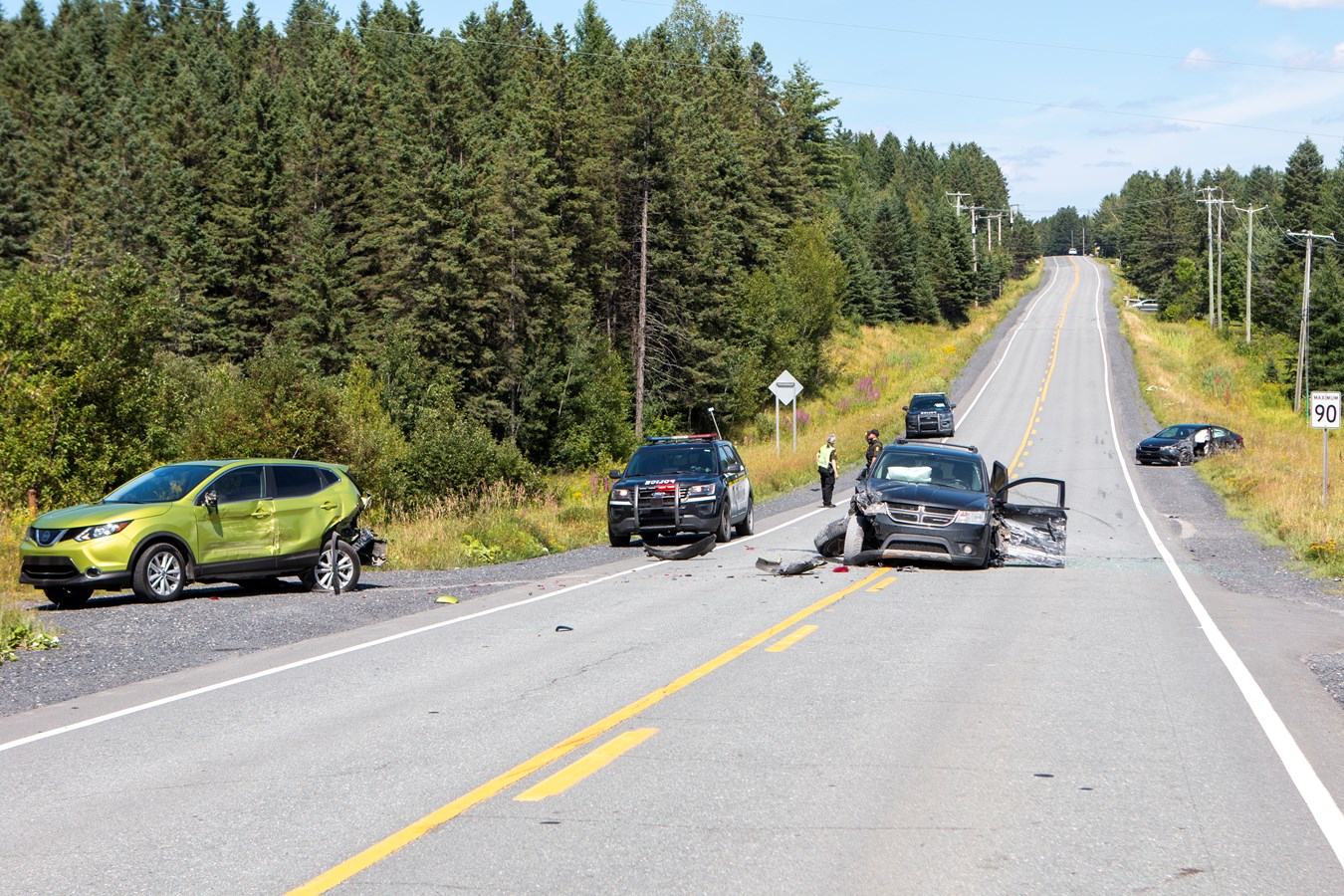 Le face à face survenu vers 13 h 15, impliquant quatre véhicules sur la route 271 à Saint-Georges, soit la 42e rue Nord, a fait cinq blessés.