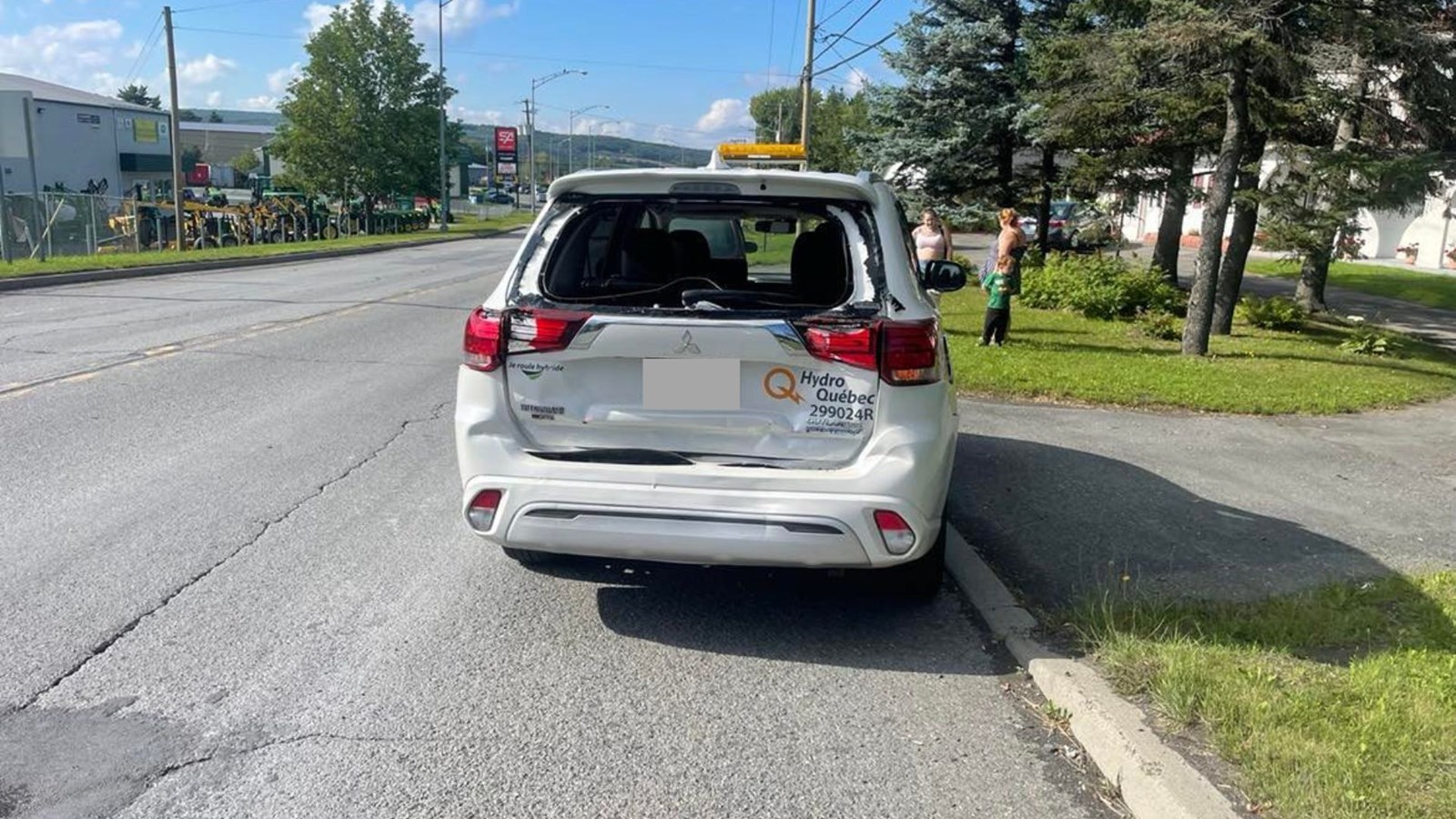 L'accident est survenu sur la 6e avenue Nord lorsqu'une fourgonnette, qui allait effectuer un virage à gauche sur la 45e rue Nord, a été emboutie par une voiture aux couleurs d'Hydro-Québec, qui elle-même a subi le même sort par une remorqueuse qui suivait derrière.