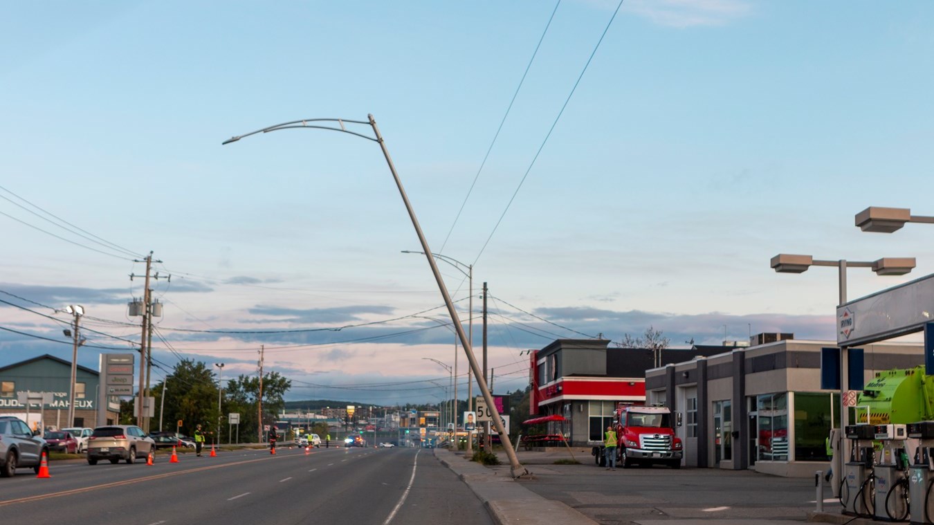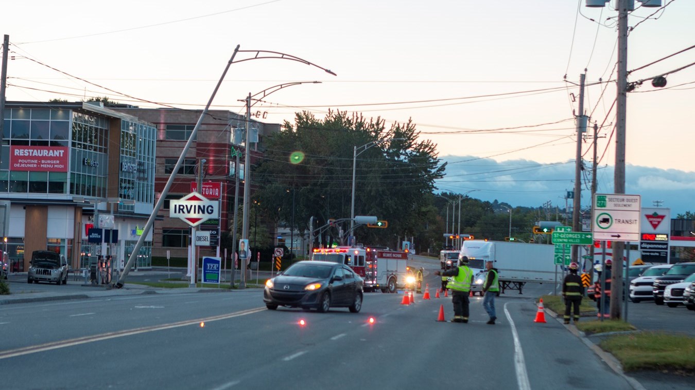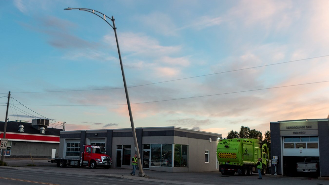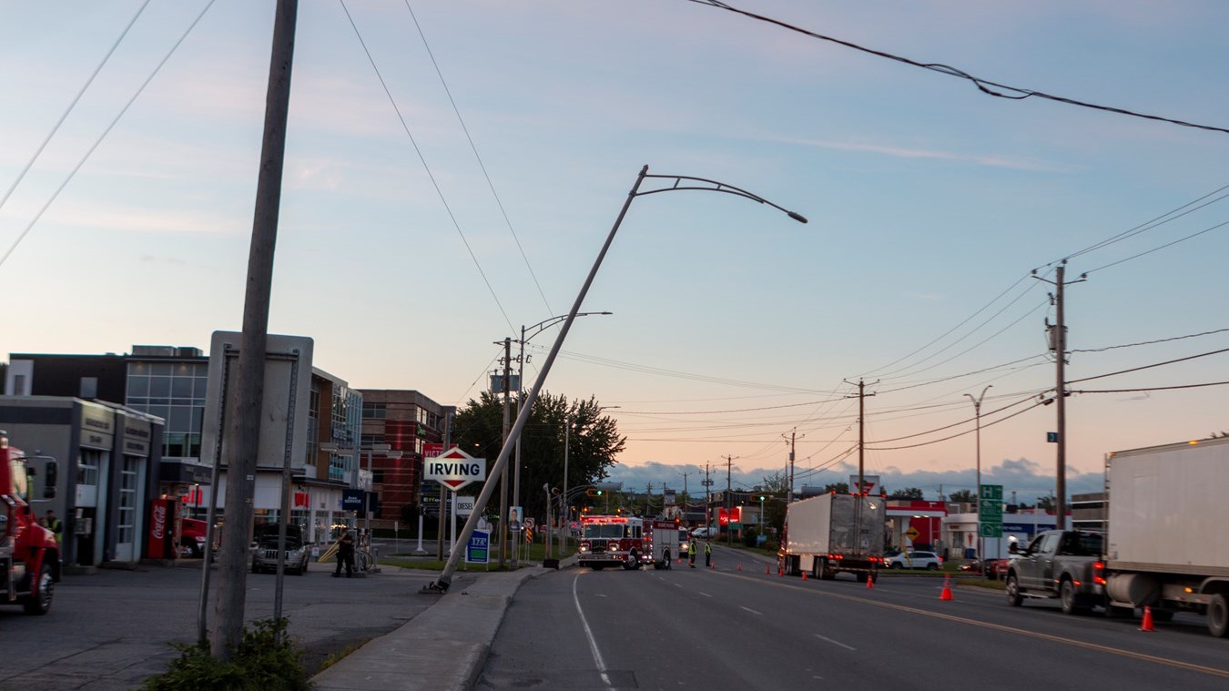 Un camion à ordures a percuté un lampadaire électrique vers 5 h 20 ce matin, au 10 275 sur le boulevard Lacroix à Saint-Georges.