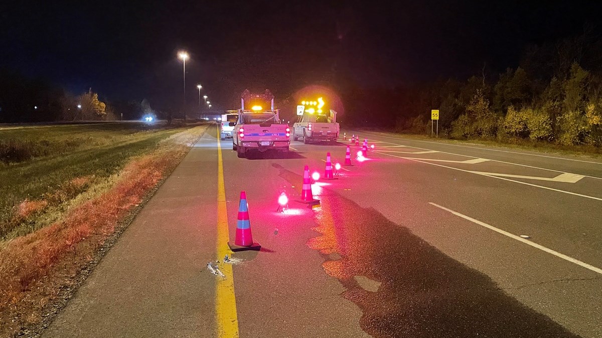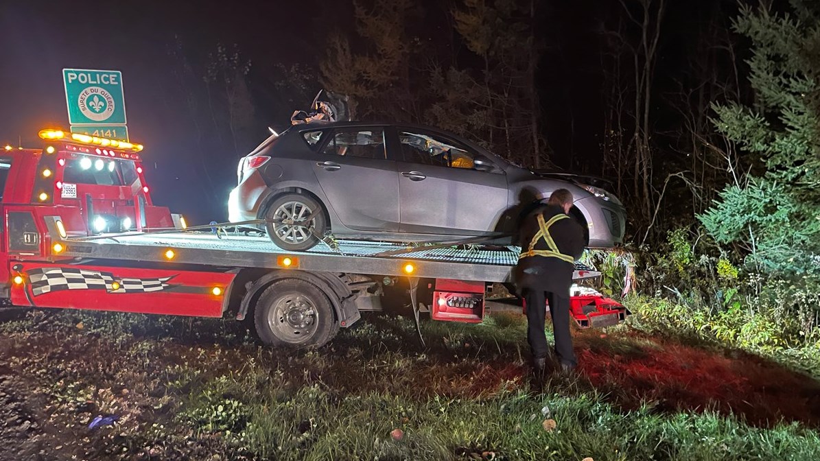 « La première c'est une conductrice de 18 ans qui est entrée en collision avec l'orignal. Elle a traversé le terre-plein central avec son véhicule et s'est ramassée dans les bois. Elle a été blessée gravement et transportée au centre hospitalier, mais on ne craindrait pas pour sa vie. »