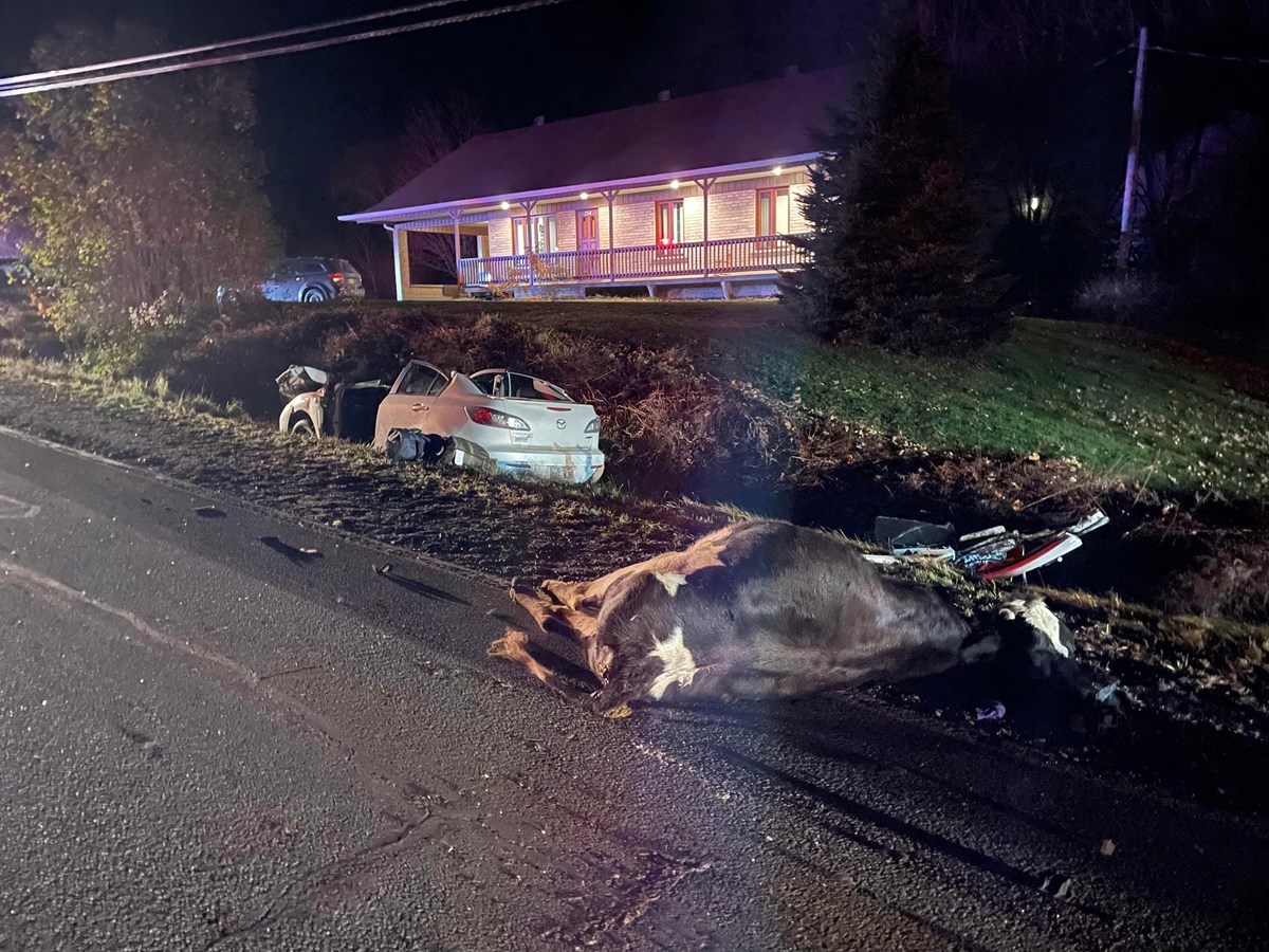 Selon la porte-parole de la Sûreté du Québec, Hélène St-Pierre, après que le jeune homme ait percuté les deux bovins, son véhicule s’est retrouvé dans le fossé.