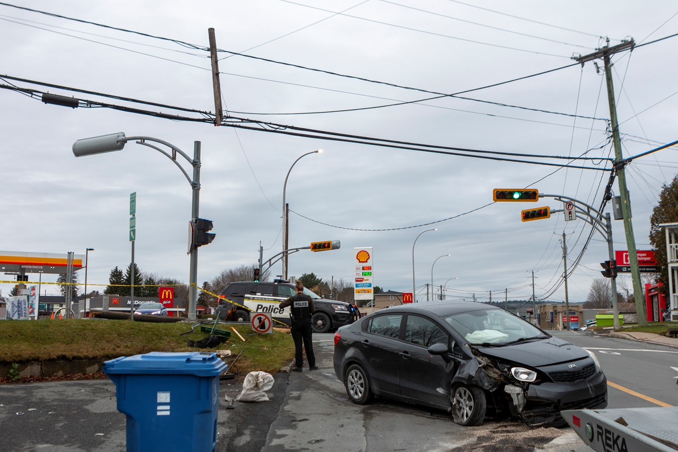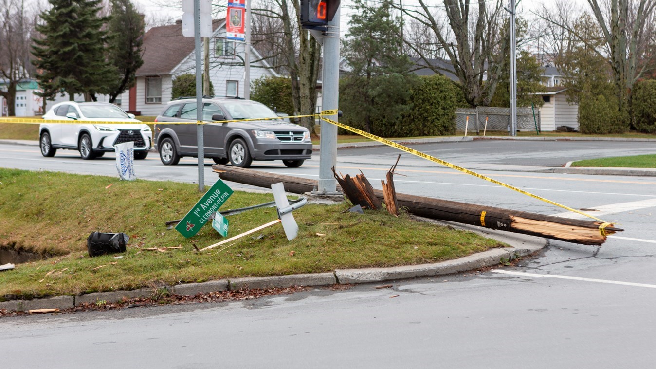 Les services d'urgences sont intervenus une première fois vers 7 h 30, à l'intersection du boulevard Dionne et de la 1re avenue Clermont pépin dans l'ouest de la ville. Une voiture était entrée en collision avec un poteau d'Hydro-Québec et quelques pancartes.