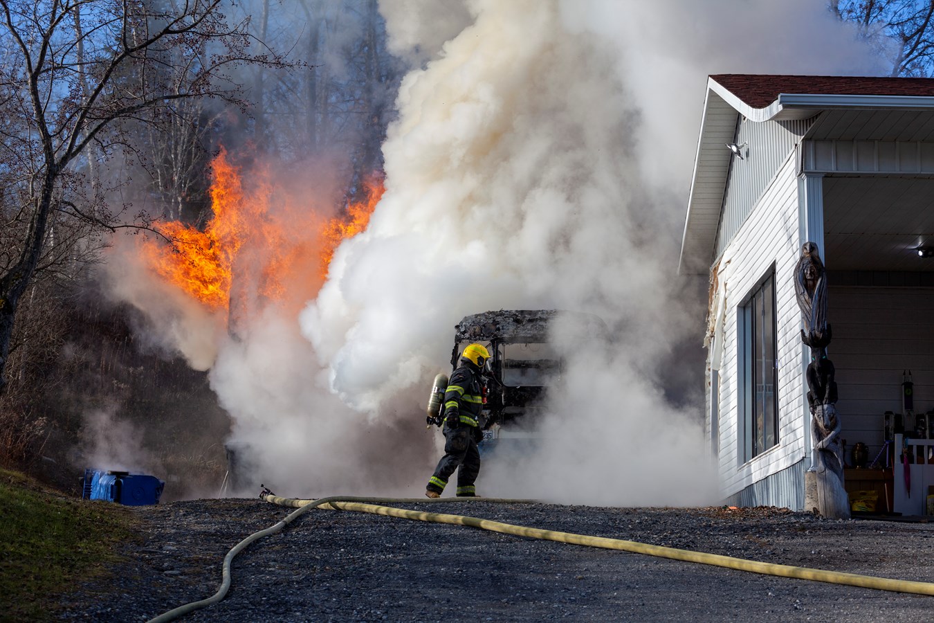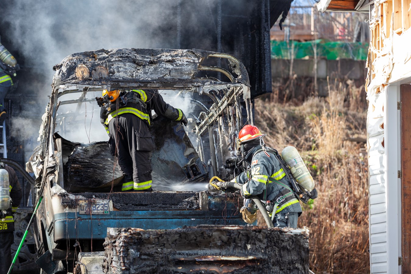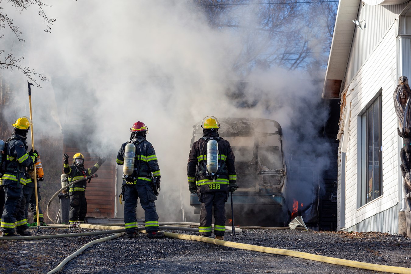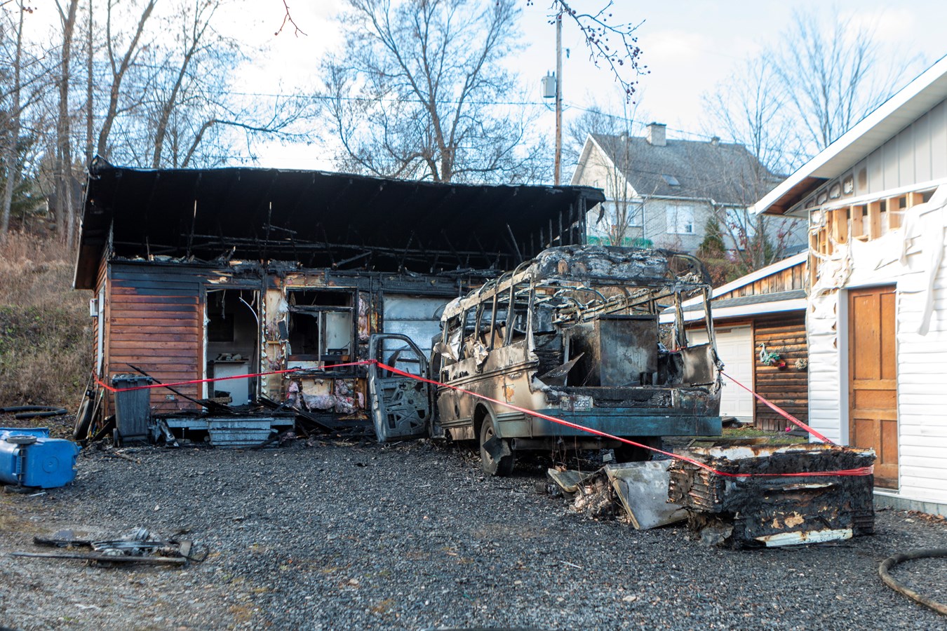 On ne connaît pas le montant des dommages encourus mais le véhicule et le bâtiment sont des pertes totales.