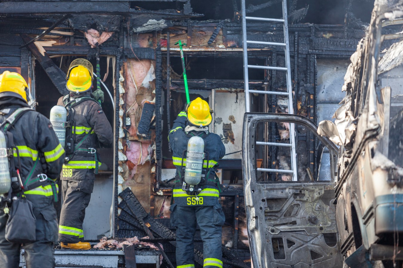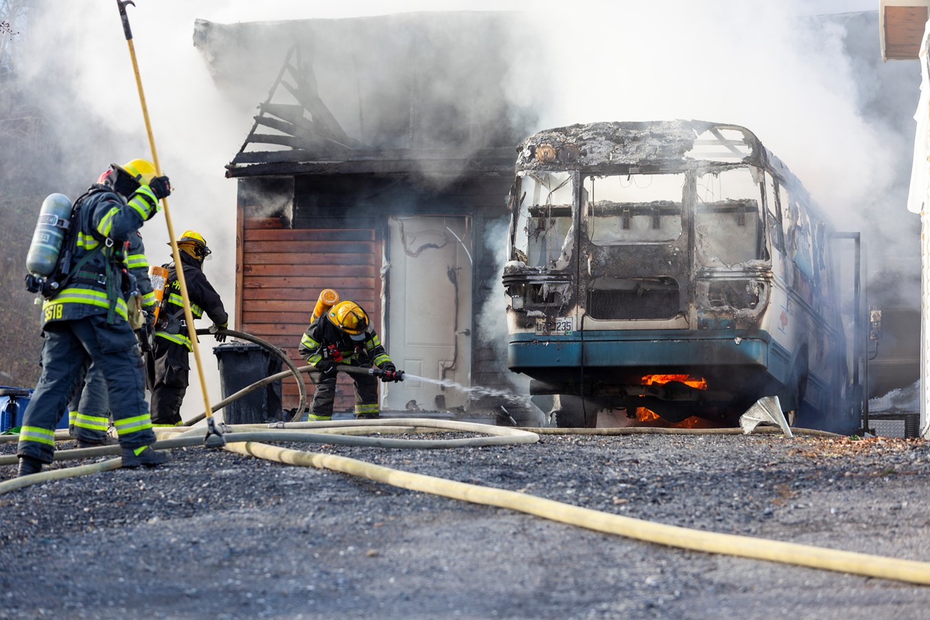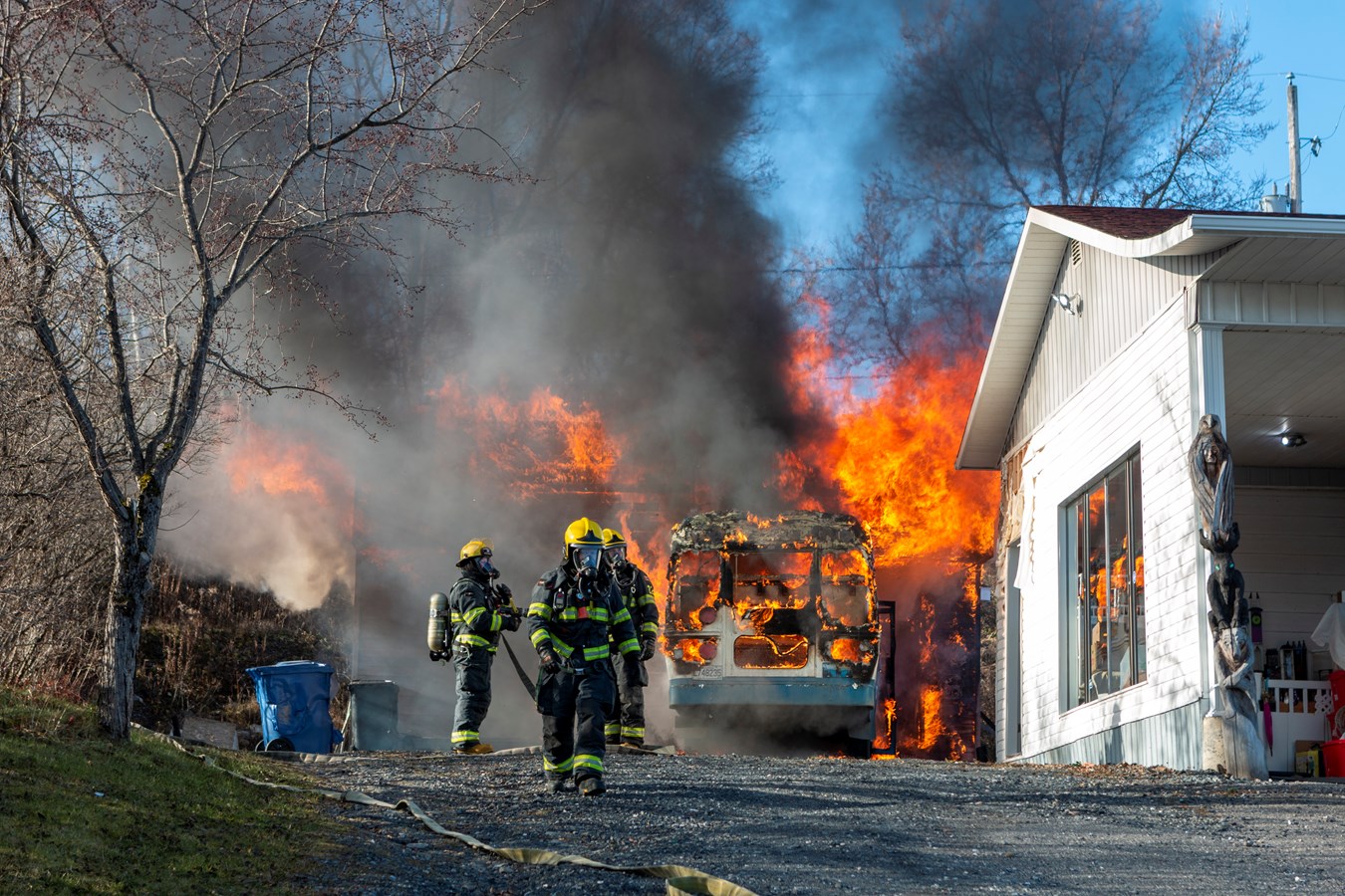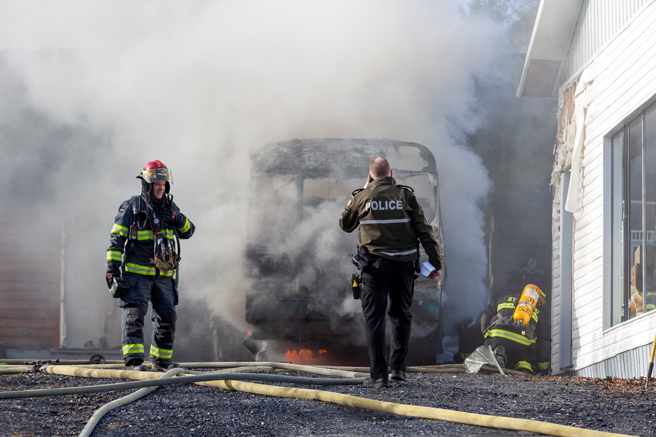 On ne connaît pas le montant des dommages encourus mais le véhicule et le bâtiment sont des pertes totales.