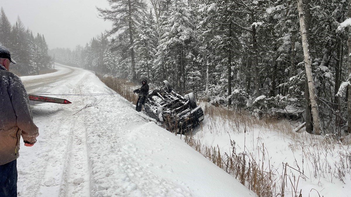 Un véhicule a fait un capotage et s'est retrouvé sur le toit dans un fossé.