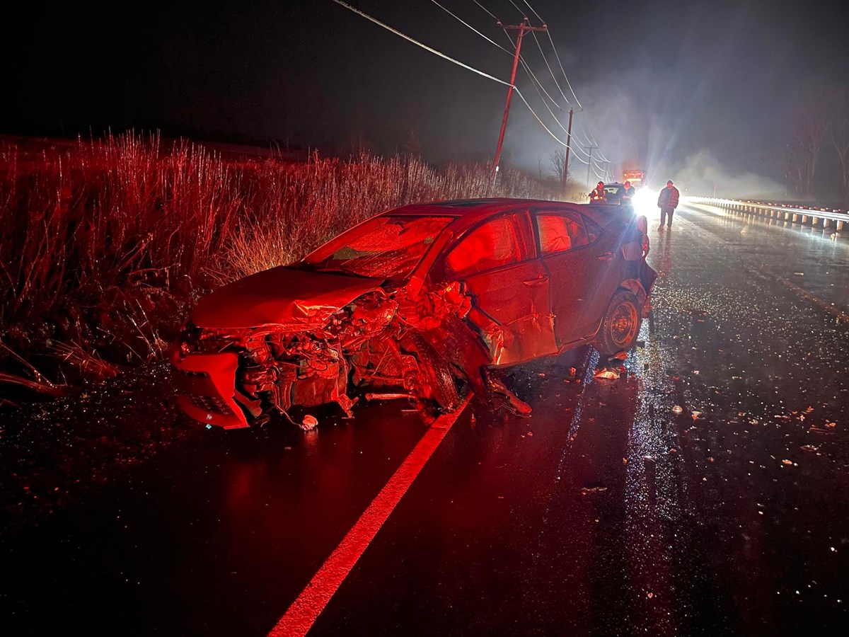 Un premier véhicule en a frappé un autre qui circulait sur la voie d'en face. Suite à ce face à face, trois personnes ont été transportées à l'hôpital de Saint-Georges pour des blessures mineures.