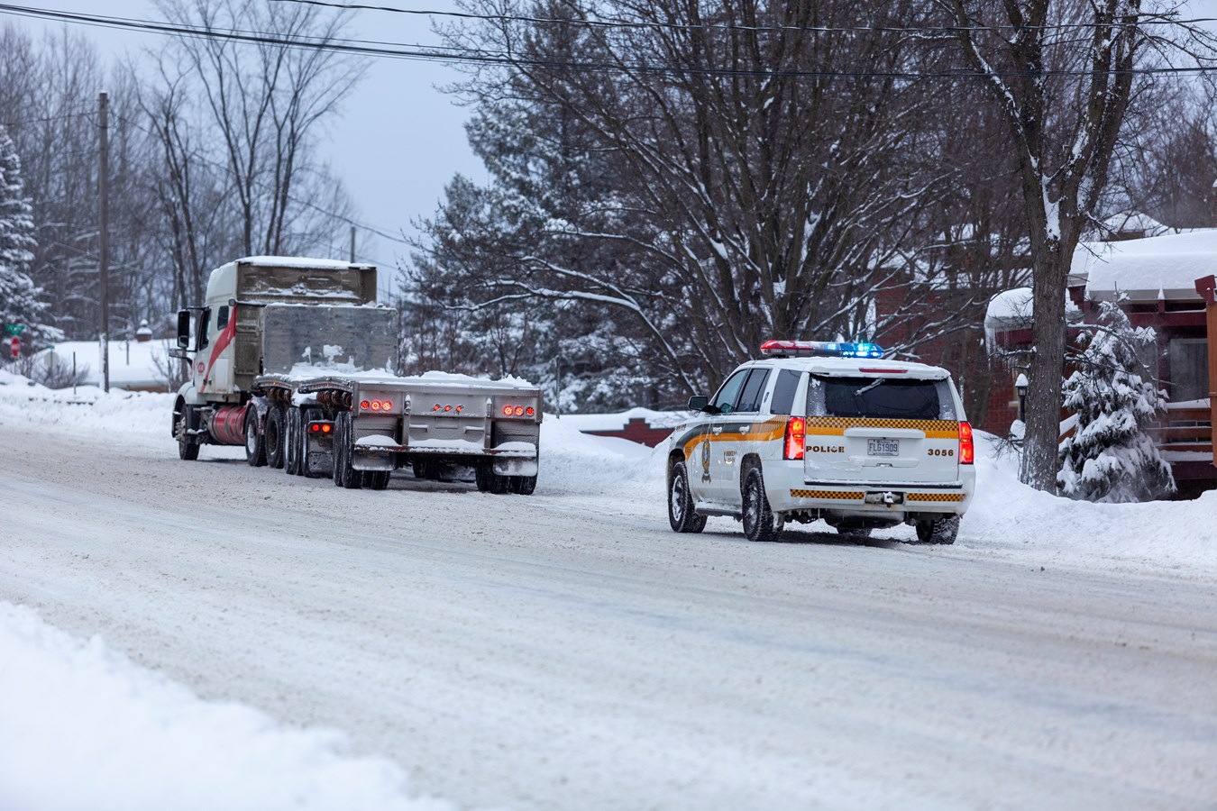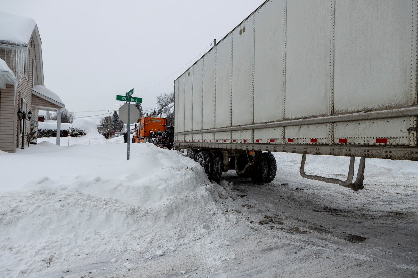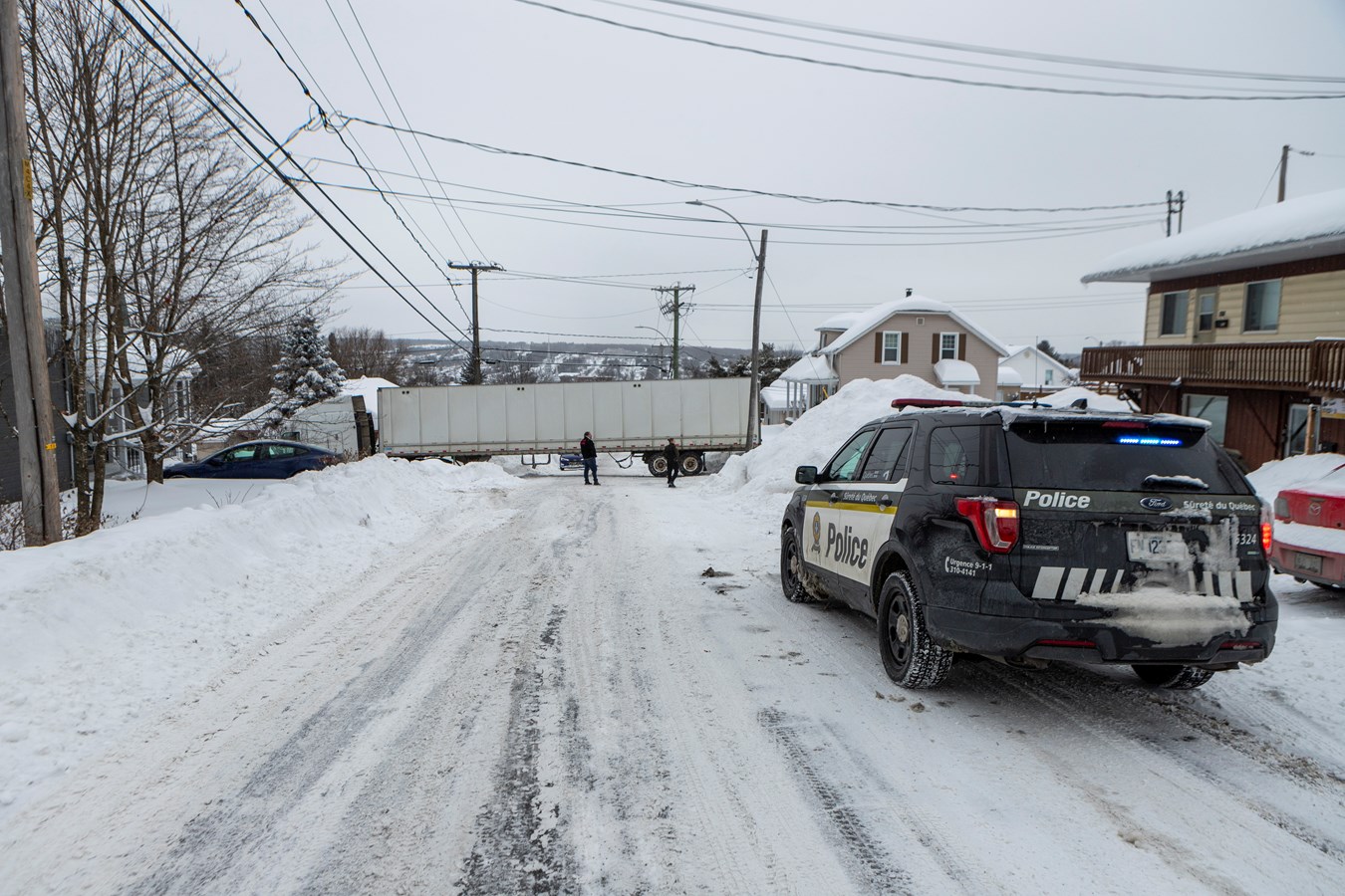 En milieu d’après-midi, un camion de 53 pieds s’est aventuré sur la 120e Rue à Saint-Georges, mais sous la chaussée glissante il n’a pas été en mesure de monter bloquant par le fait même toute la rue. Une remorqueuse pour les poids lourds a été nécessaire. La Sûreté du Québec lui a remis un constat d’infraction, car il est interdit de prendre cette rue pour les véhicules poids lourds. L’opération de remorquage a pris une trentaine de minutes.