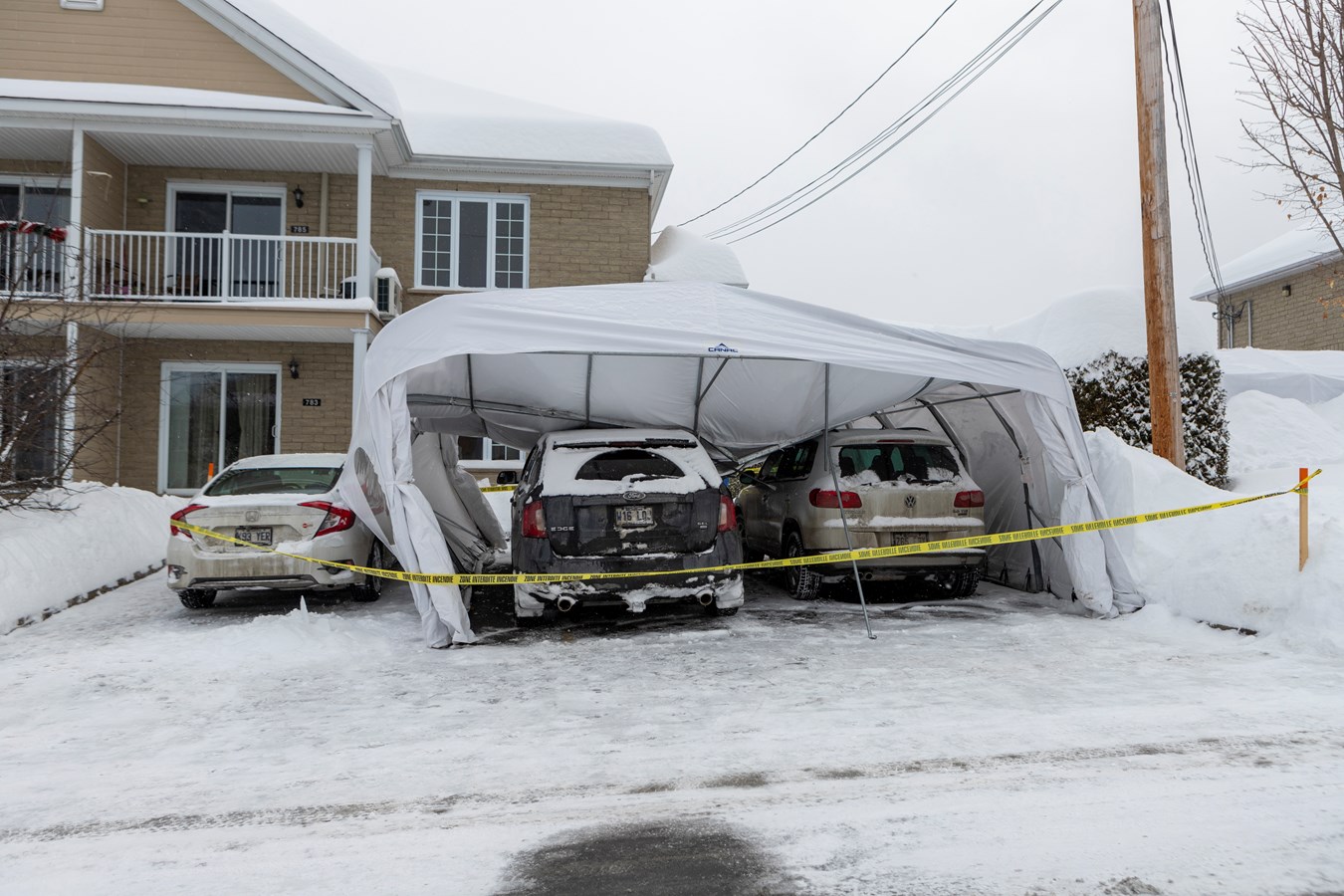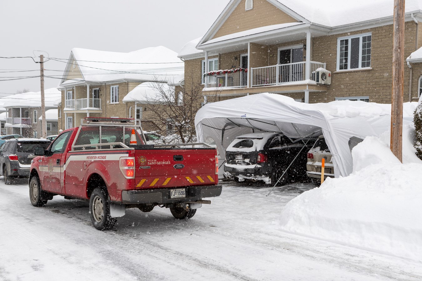 Vers midi, sur la 26e Rue à Saint-Georges, un abri garage s’est effondré sous le poids de la neige. Des véhicules se trouvaient sous la toile.