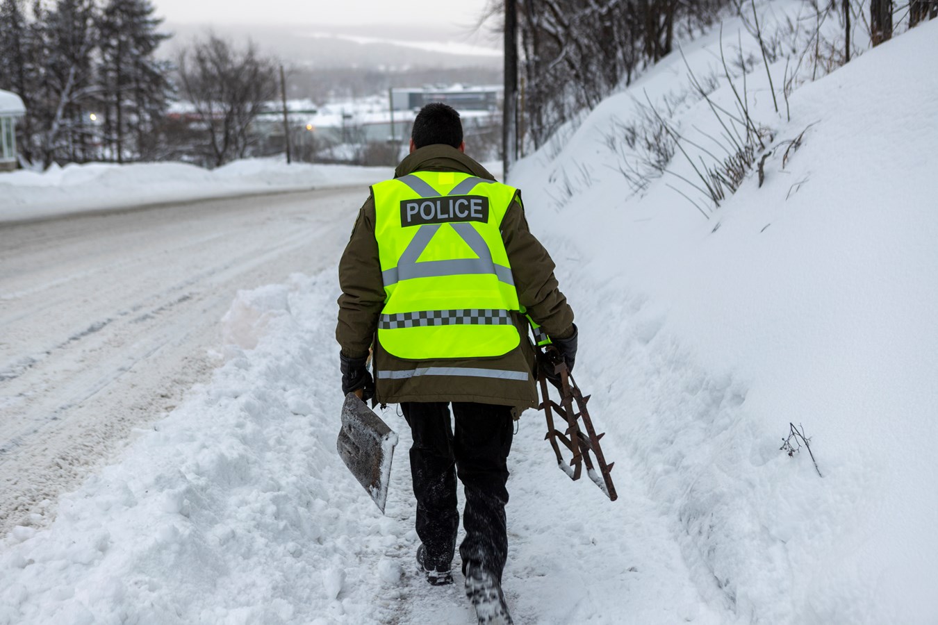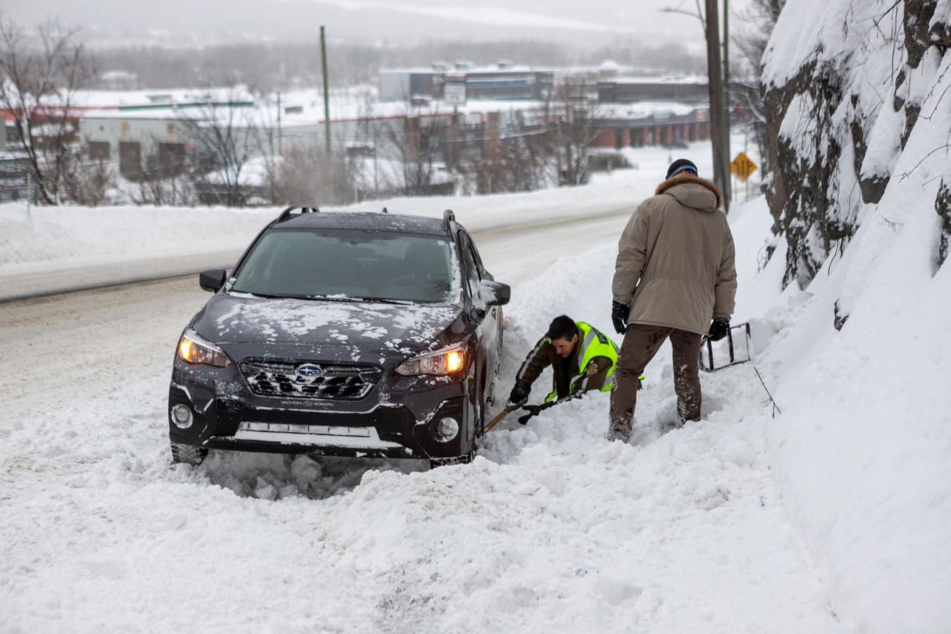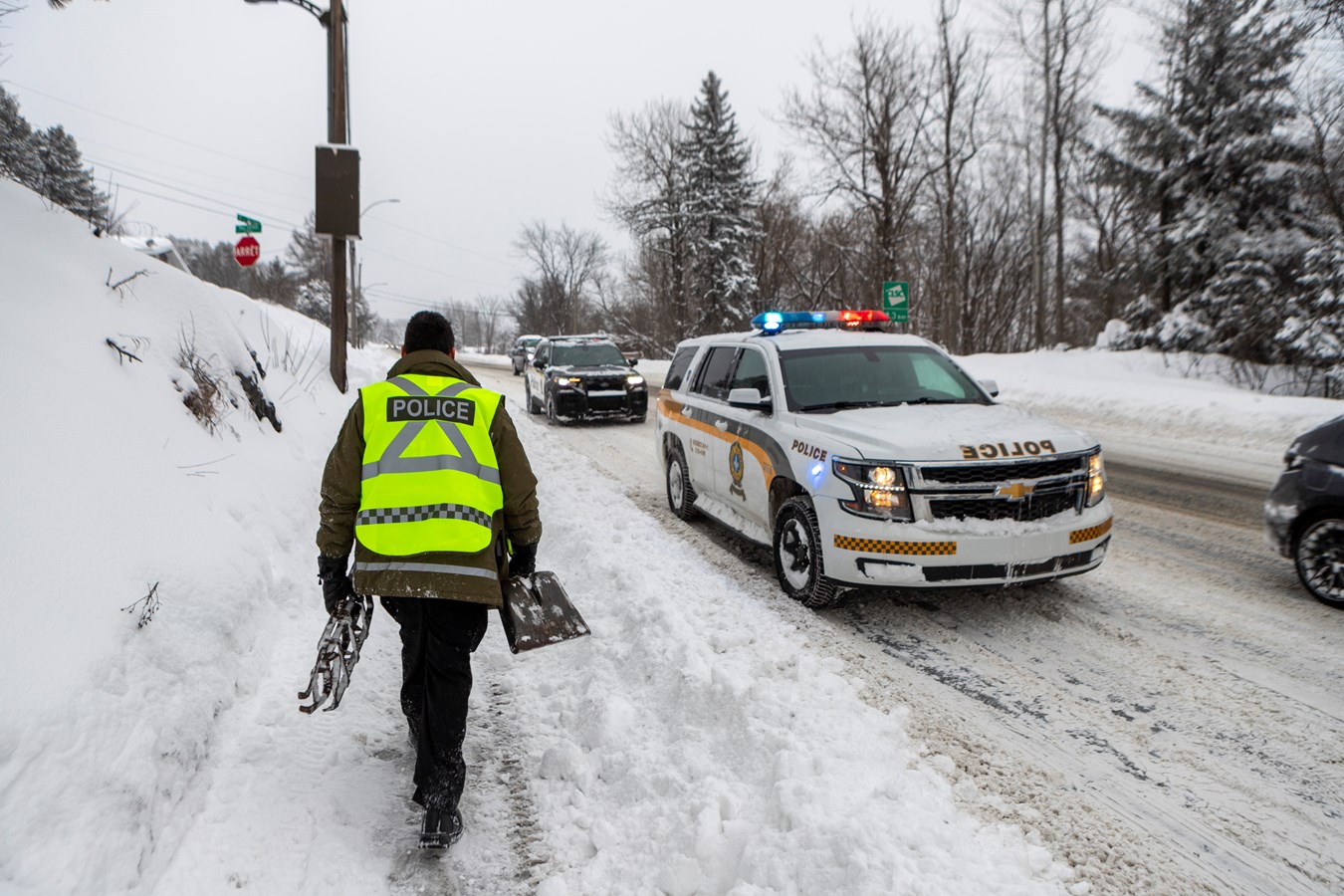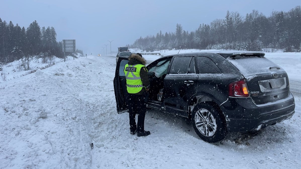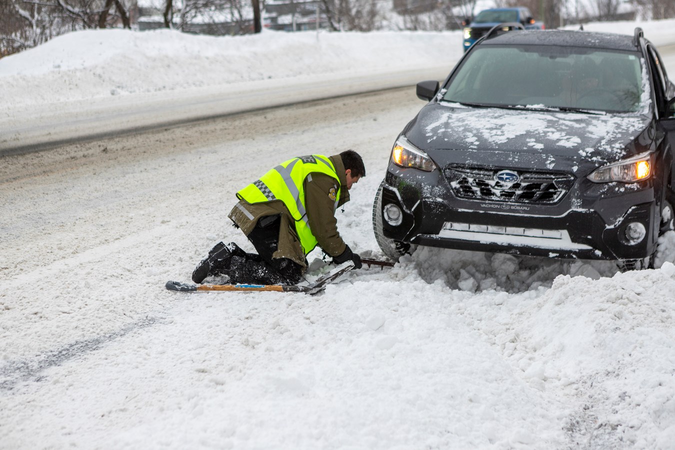 Peu après, un véhicule a fait une sortie de route sur le boulevard Lacroix et a fait un tête à queue. Il est malheureusement resté coincé dans la neige. L’agent de la Sûreté du Québec a aidé le citoyen à l’aide d’une pelle et de plaques d'adhérence à se dégager.