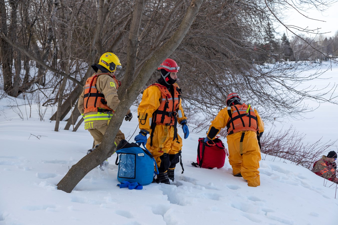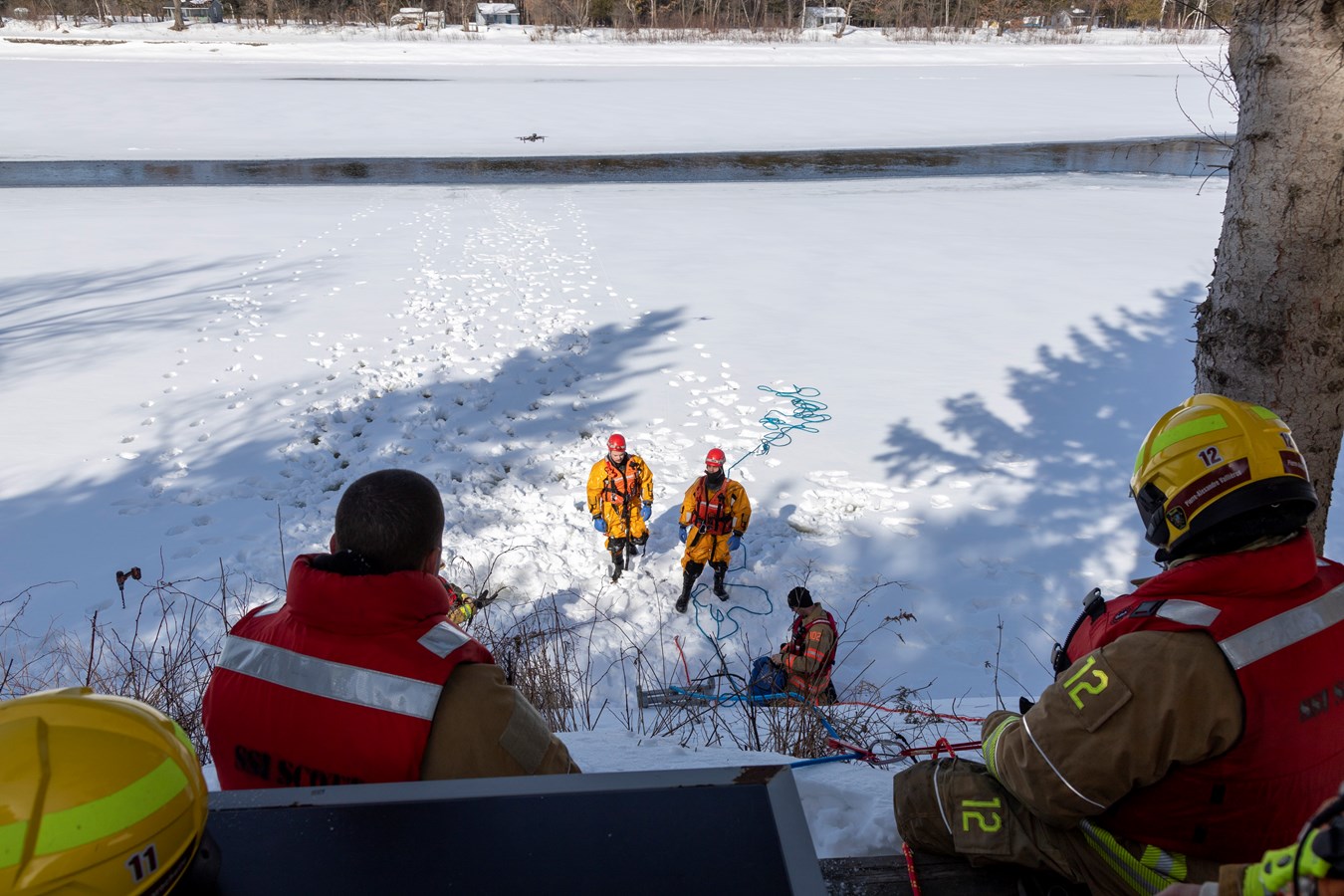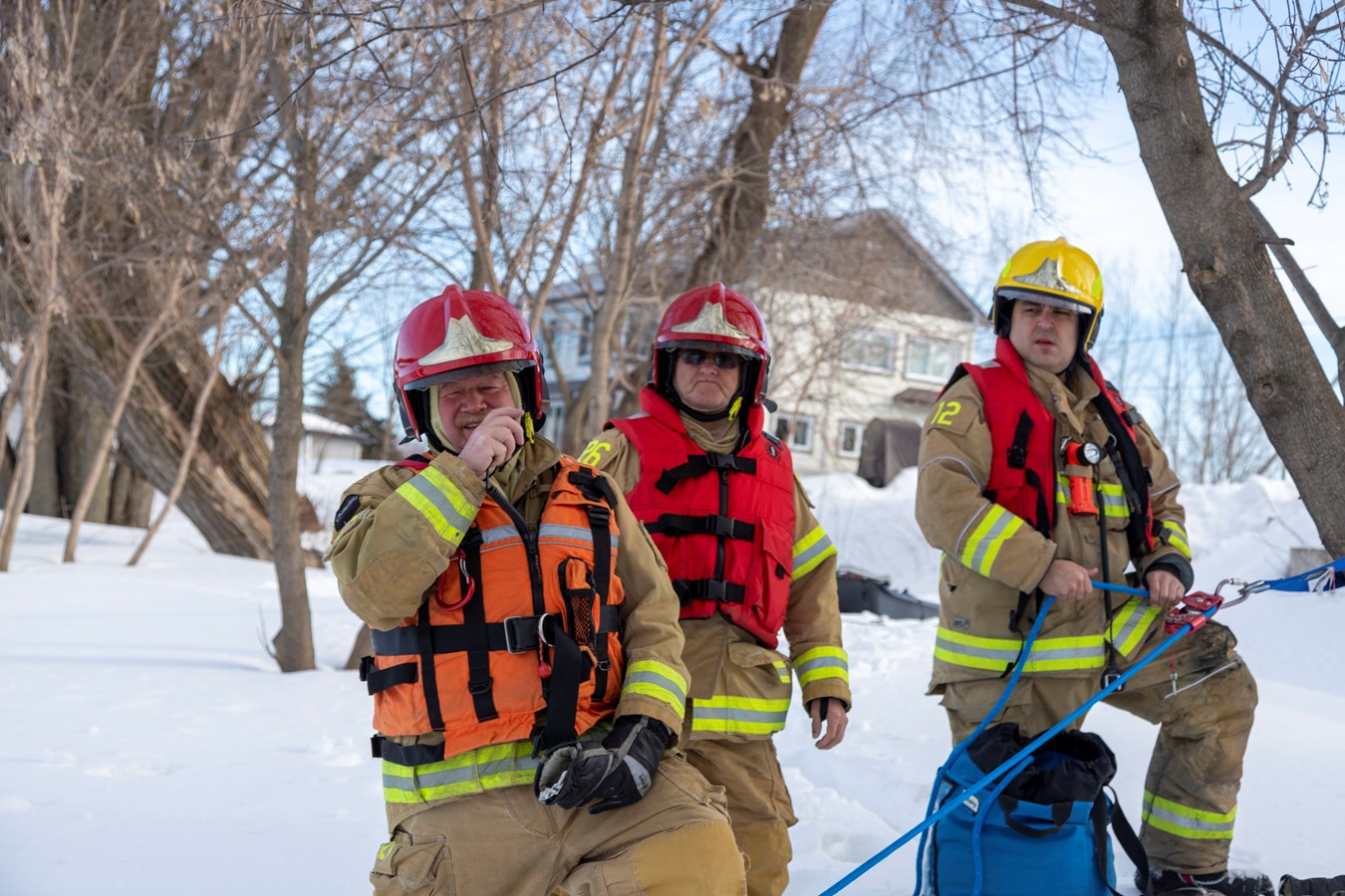 Si vous étiez dans le secteur de Scott sur le bord de la rivière, près de la rue Brochu, hier, peut-être avez-vous aperçu des manteaux jaunes sur les glaces sur le côté Est. Il s’agissait d’une partie des pompiers du Service de sécurité incendie de Scott qui se pratiquait à sauver des vies.