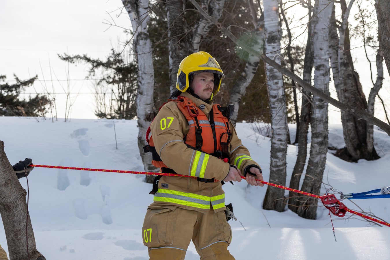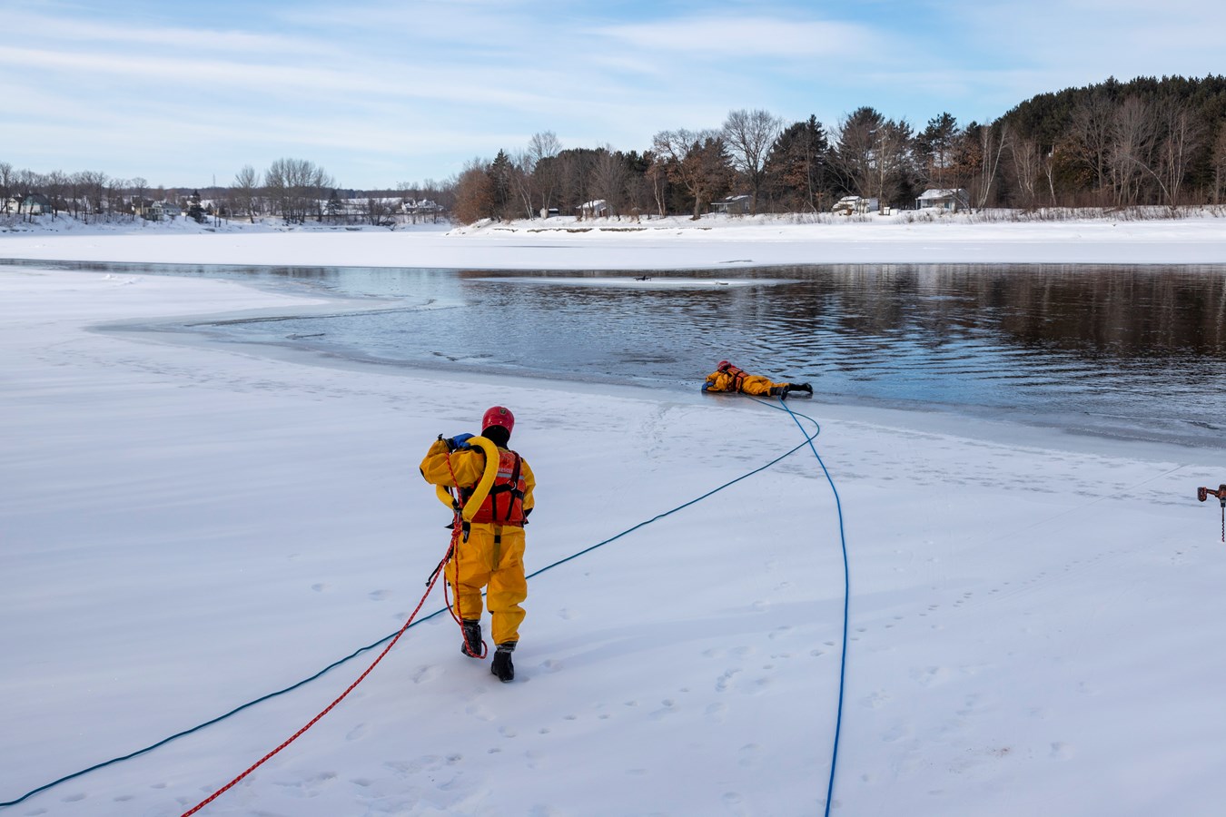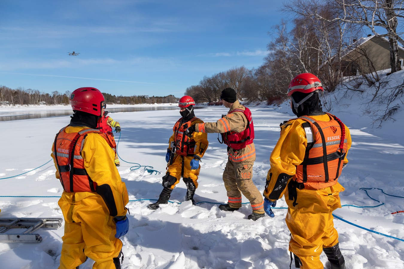 Si vous étiez dans le secteur de Scott sur le bord de la rivière, près de la rue Brochu, hier, peut-être avez-vous aperçu des manteaux jaunes sur les glaces sur le côté Est. Il s’agissait d’une partie des pompiers du Service de sécurité incendie de Scott qui se pratiquait à sauver des vies.