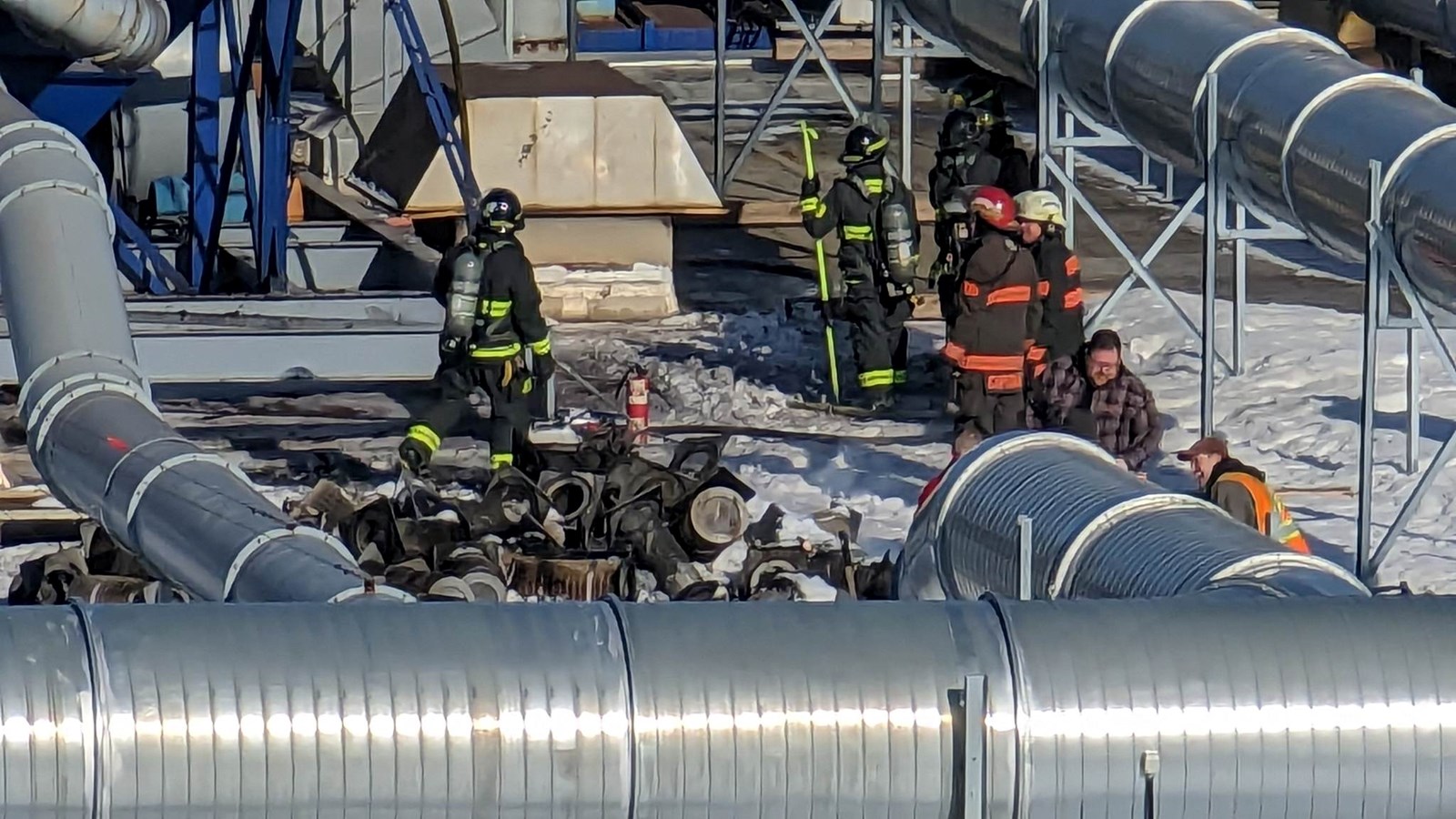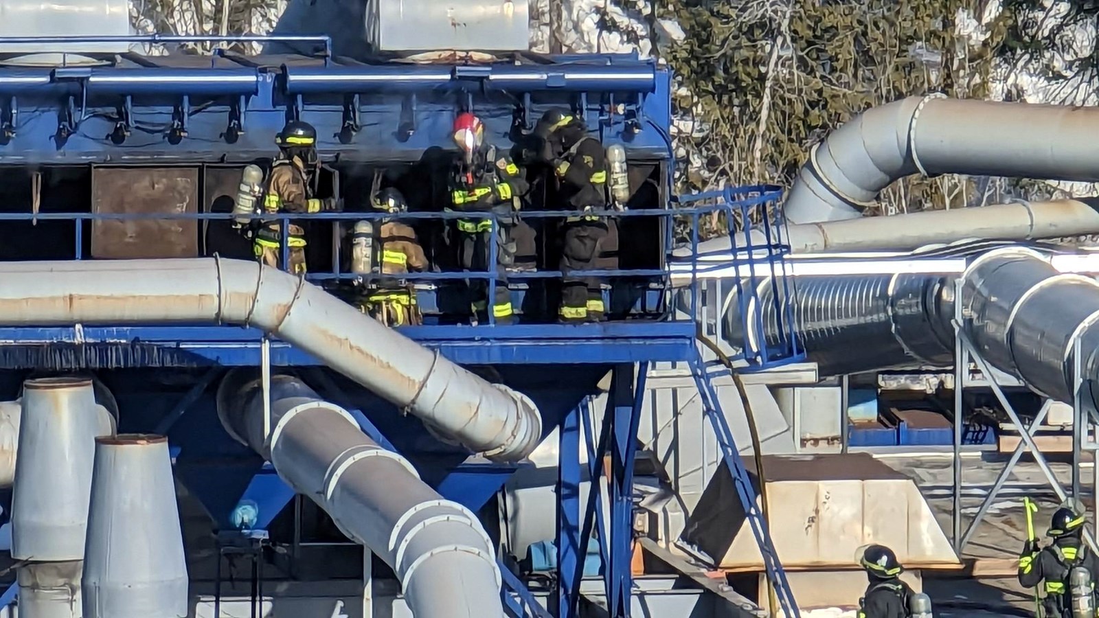 Selon le directeur du SSI de Saint-Georges, Sylvain Veilleux, son équipe procède à l’extinction et a démantelé l’un des dépoussiéreurs sur le toit qui a pris feu.