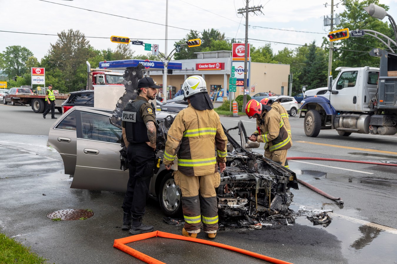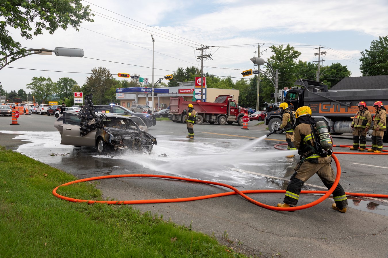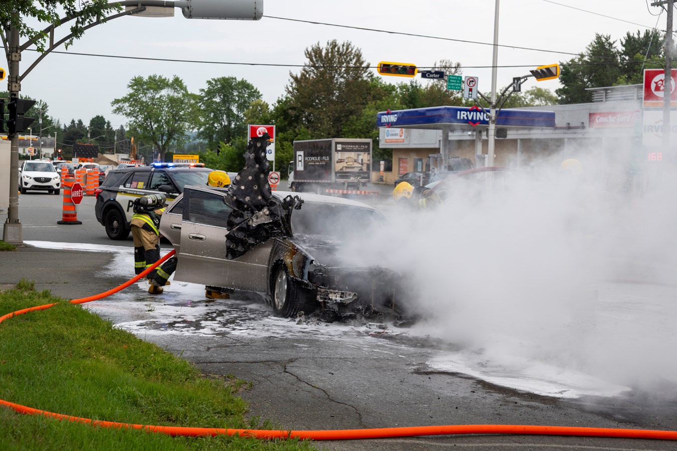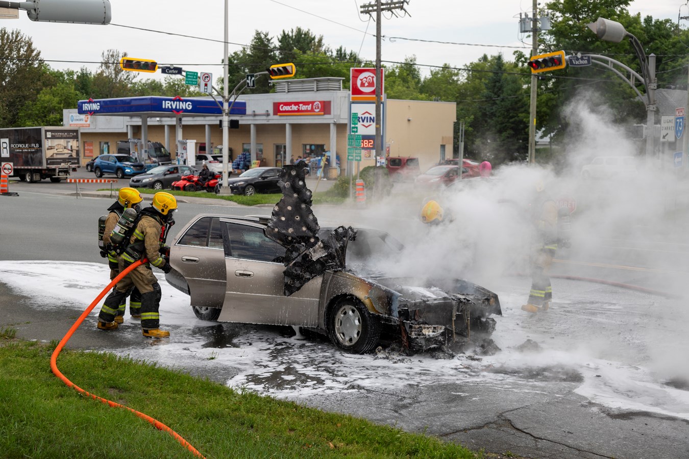 Les pompiers ont procédé à l'extinction de l'auto, pendant que des policiers de la SQ se sont chargés de fermer le Boulevard Vachon Sud. L'intervention a duré près de 45 minutes.