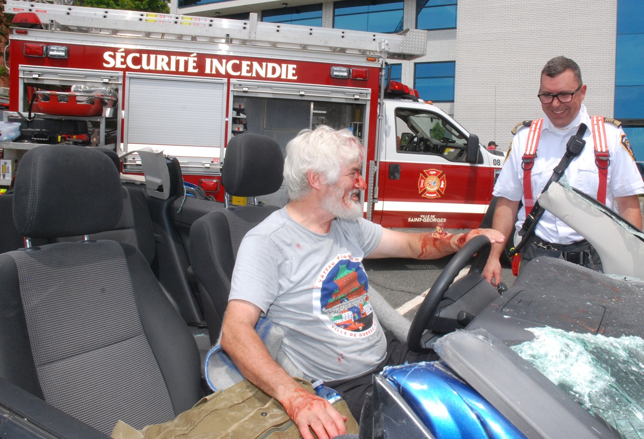 C'est un bénévole, Yvon Claveau, qui a joué le rôle du conducteur blessé lors de l'accident simul.