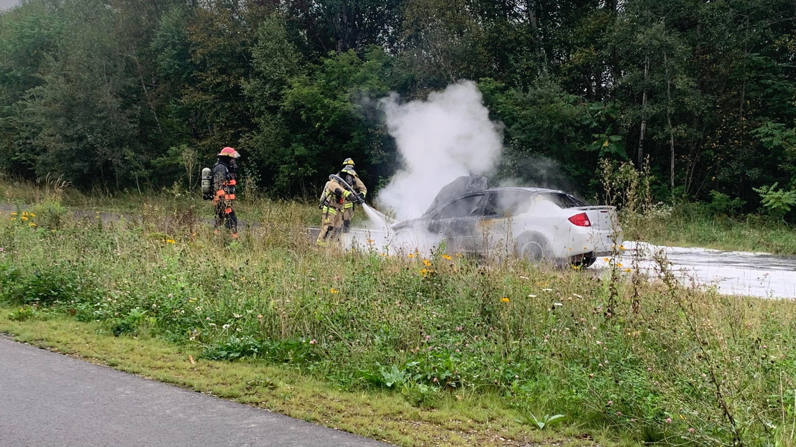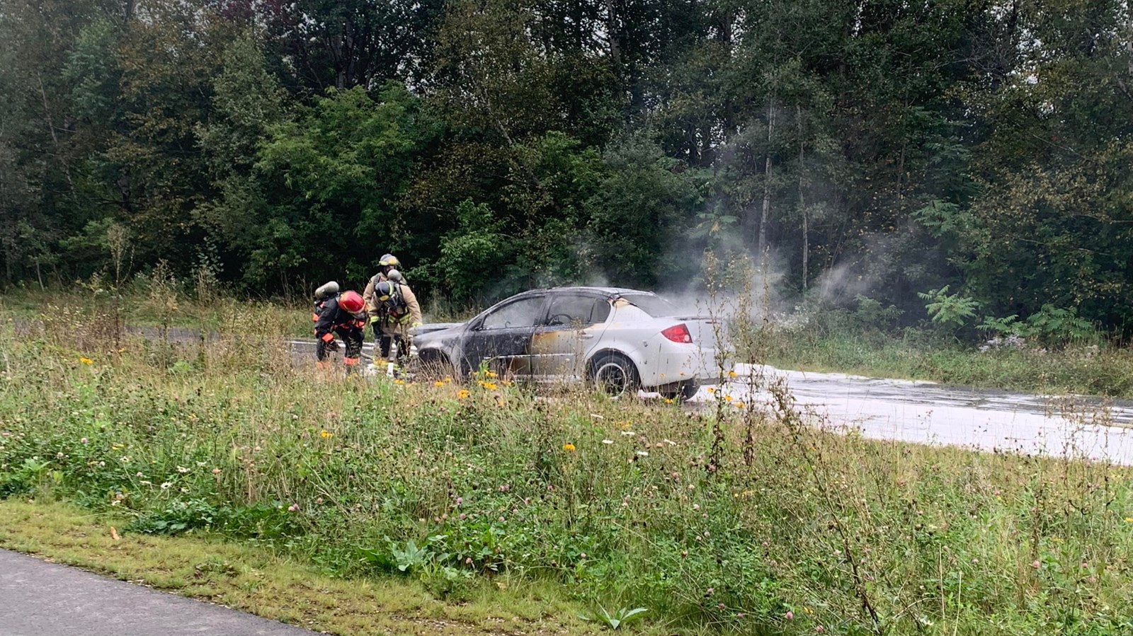 À l'arrivée des pompiers, ces derniers ont constaté un embrasement généralisé du véhicule et ont procédé à l'extinction rapide du feu.