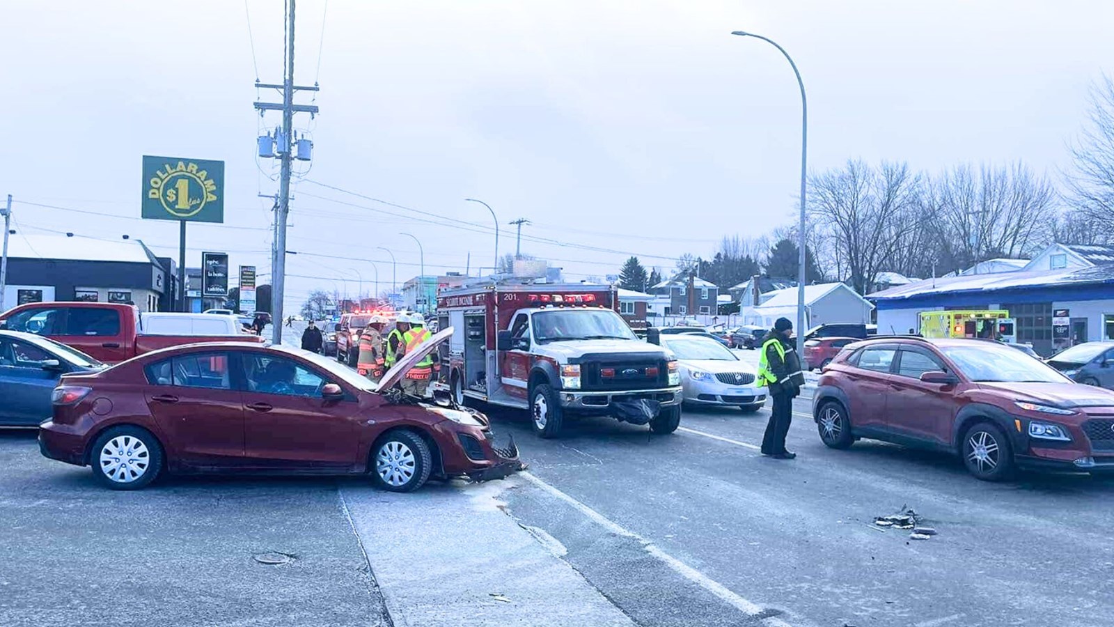 Un accident mineur, impliquant deux véhicules est survenu ce matin, peu après 11 h, à la sortie du stationnement du commerce Dollarama, sur le boulevard Dionne à Saint-Georges, à l'intersection de la 10e rue.