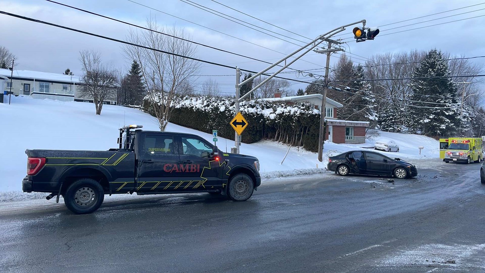 Une voiture et un pick-up sont impliqués. Ce dernier a terminé sa course dans un banc de neige.