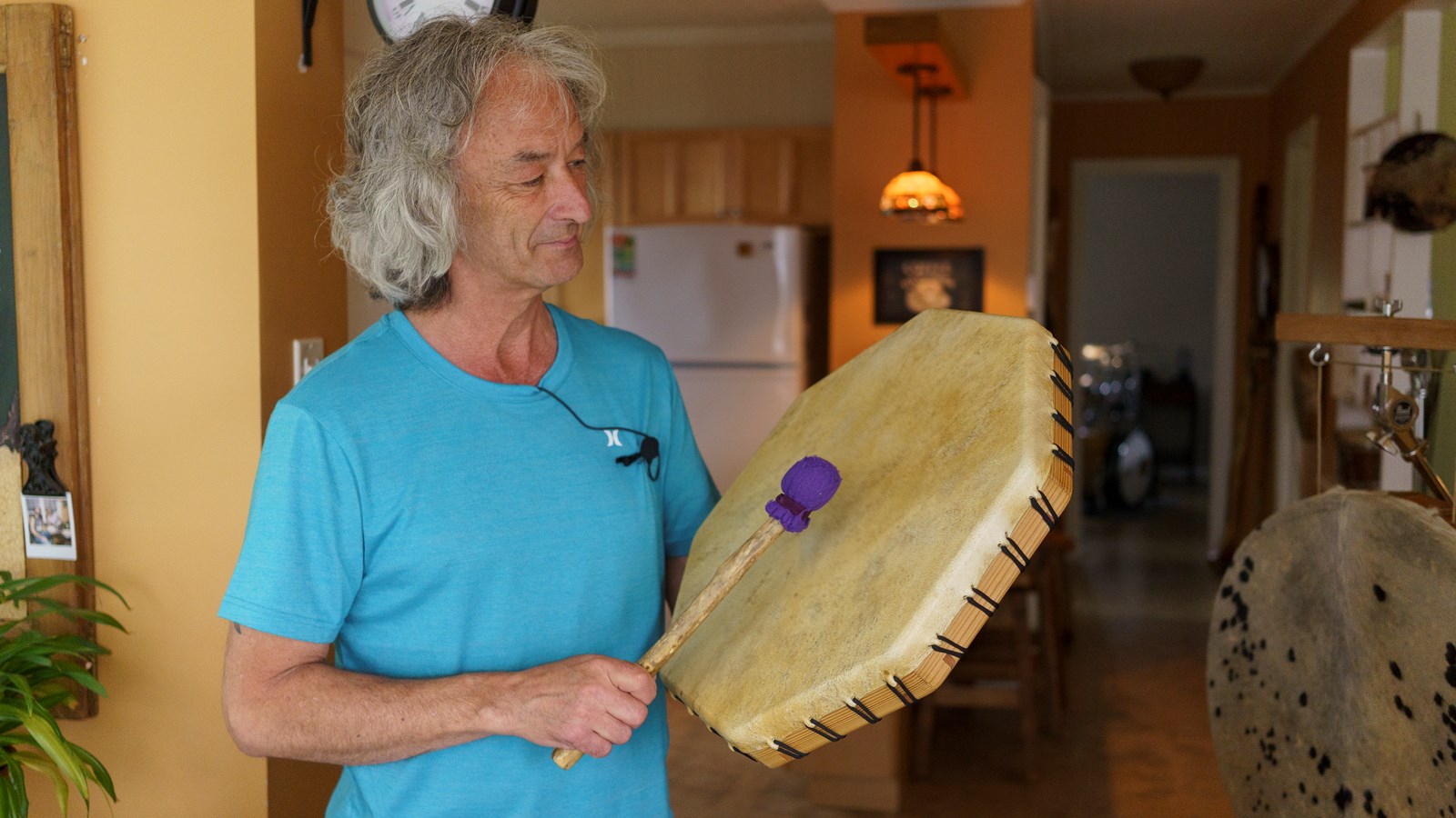 Régis Roy est un résident de Saint-Isidore de 63 ans qui est animé par les sons qui l'entourent et surtout par les percussions et le tambour depuis son plus jeune âge.