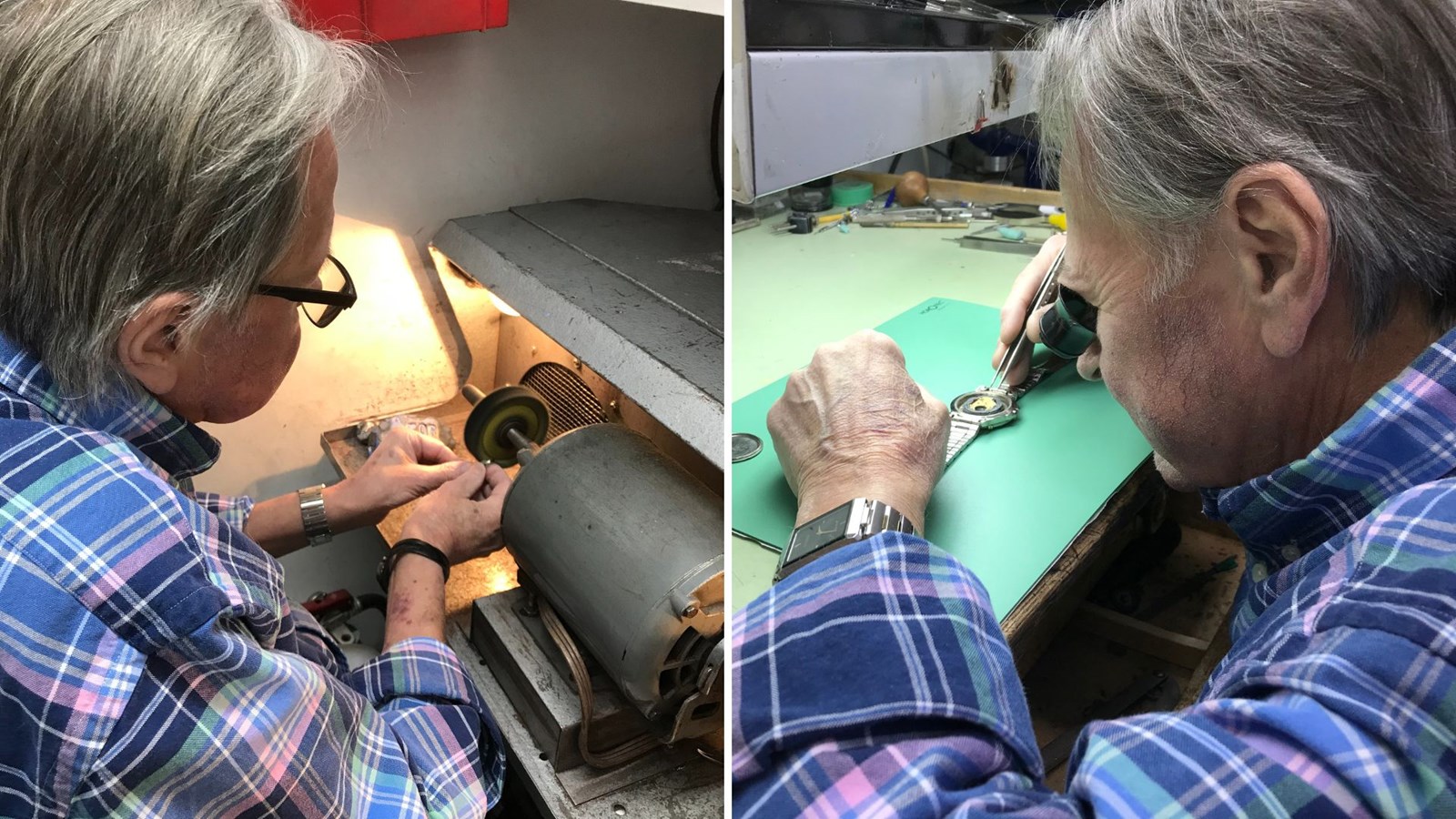 Photo de gauche: Alain Poulin qui polie un bijou, avant de le remettre à un client. Photo de droite: réparation conventionnelle d'une montre.