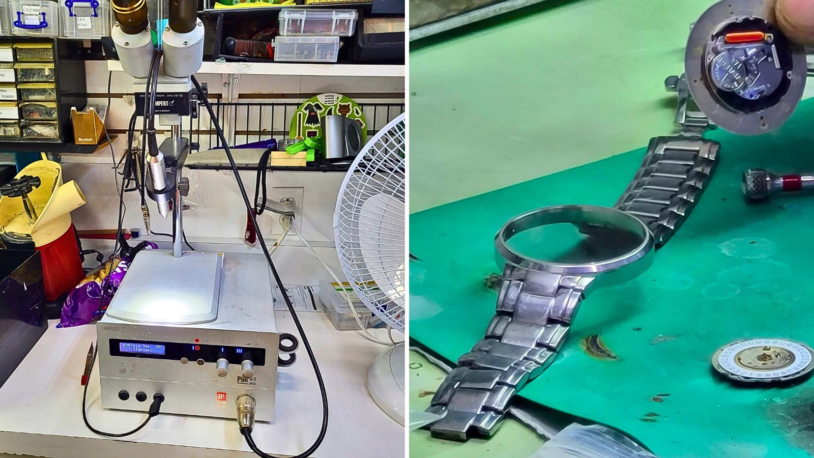 Méthodes de réparations contemporaines, avec à gauche, une soudeuse à bijou électrique et à droite, un mécanisme de montre d'aujourd'hui.