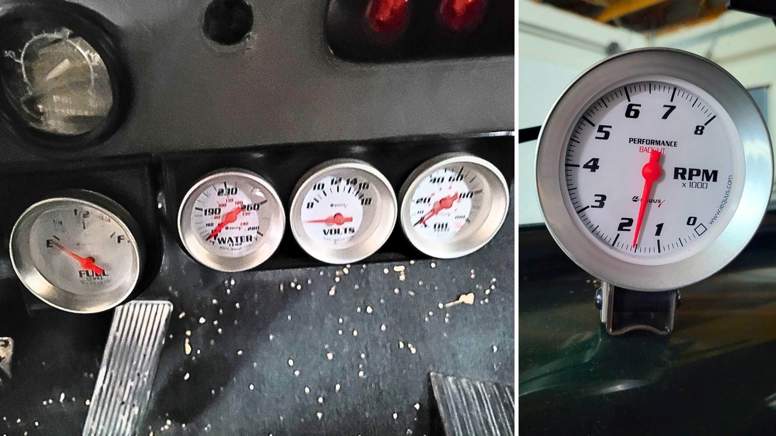Quelques cadrans à l'intérieur de la Mercury 1953, indiquant le niveau d'essence, le niveau d'huile, le voltage, le RPM, etc.