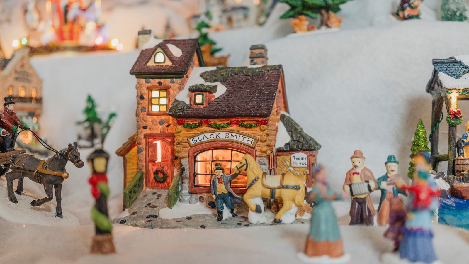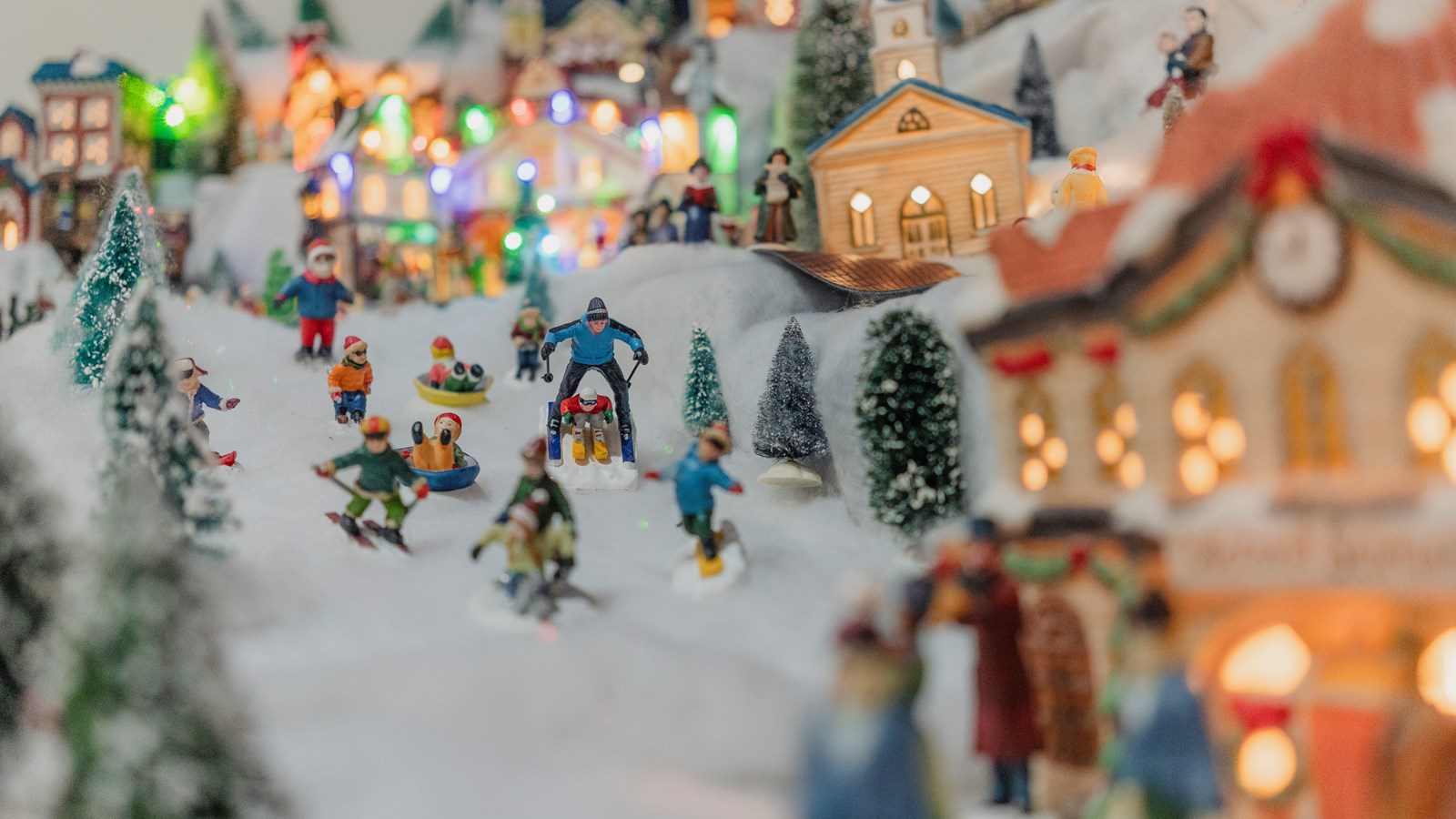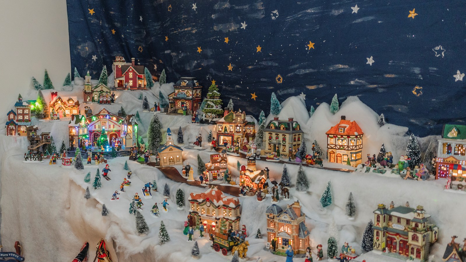 Dans ce village on peut voir un forgeron, une ferme, une cabane à sucre, une crèche , une patinoire, une microbrasserie, une cathédrale, une descente de ski et un manège, pour ne citer que ces édifices. Il y a même un mariage et une chorale. Évidemment, il y a de nombreuses petites lumières dans les maisons et de la musique de Noël.