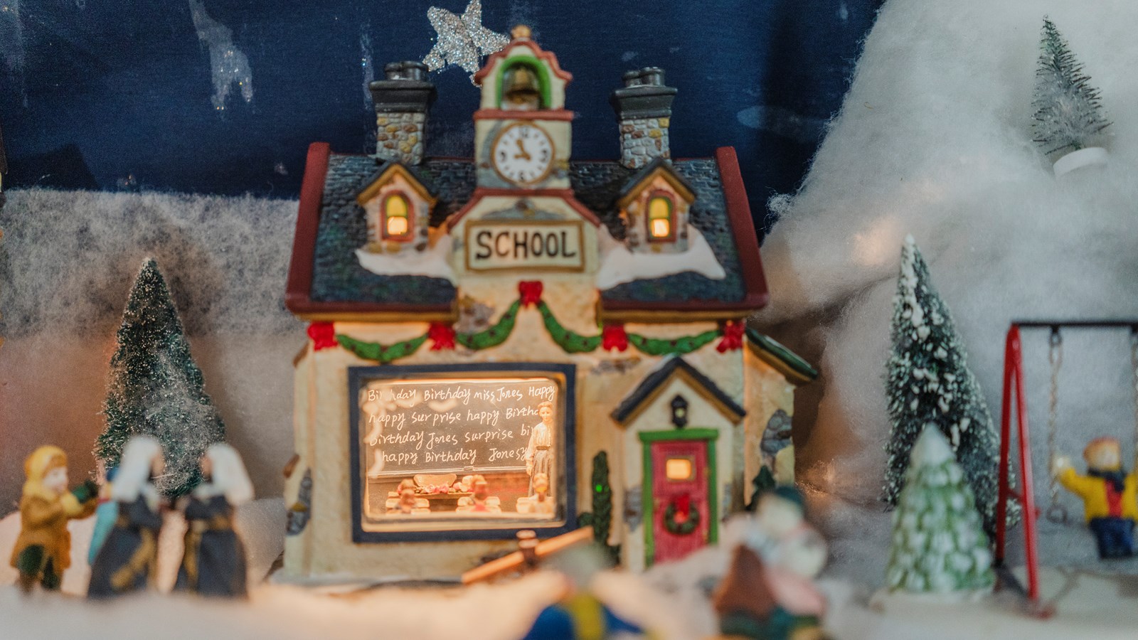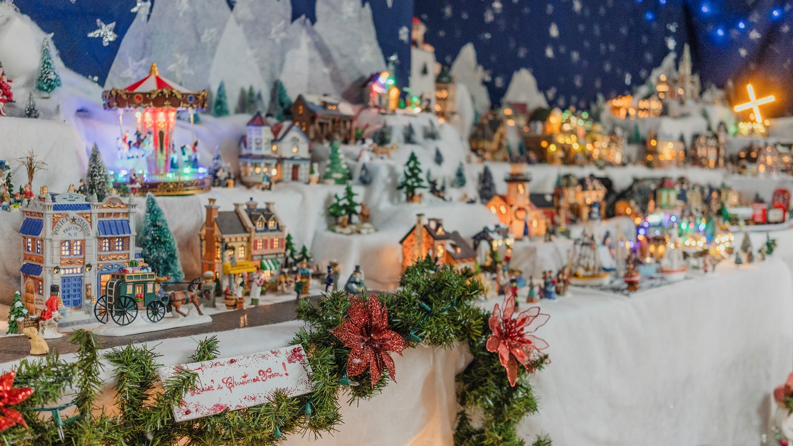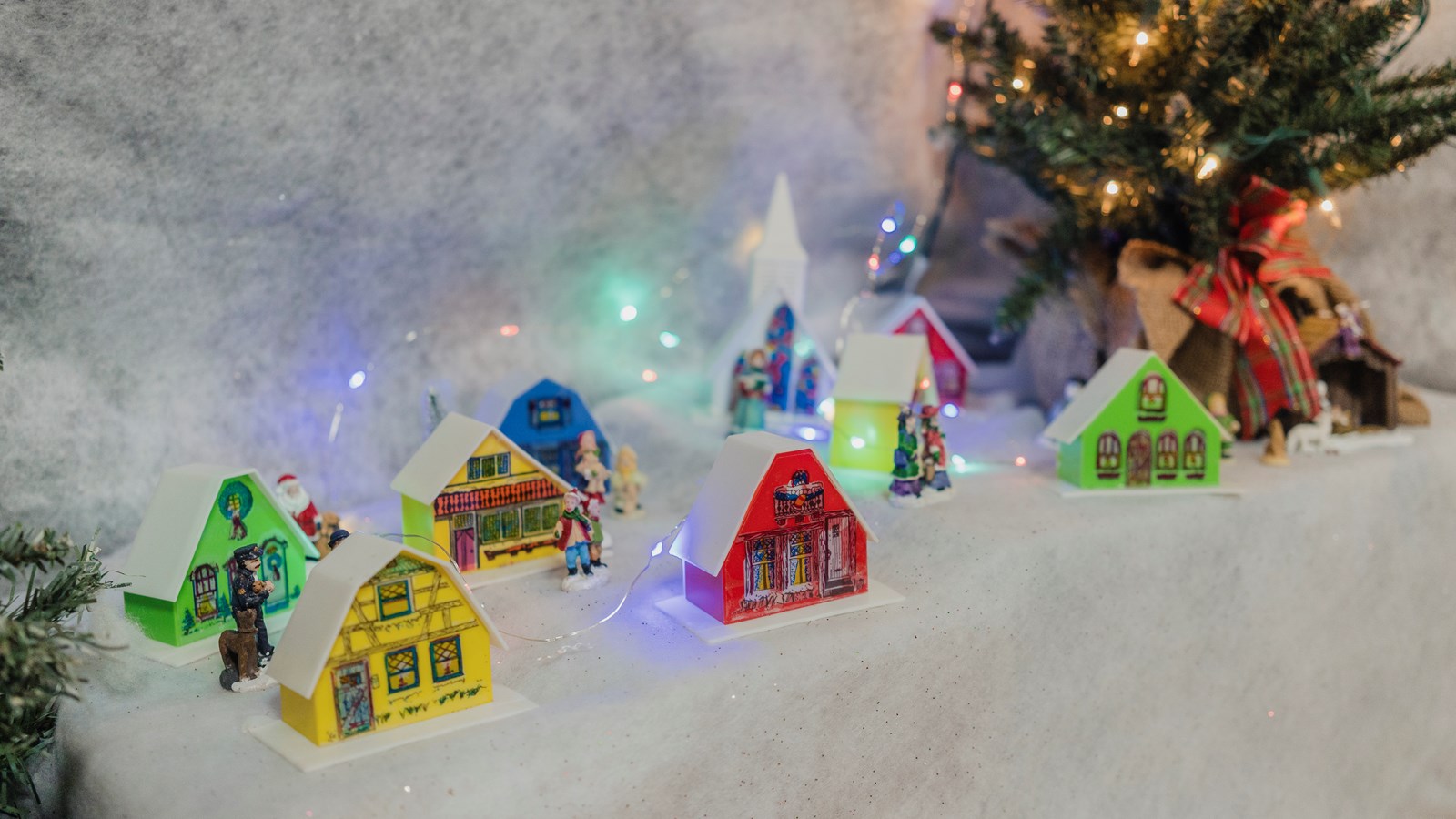 Dans ce village on peut voir un forgeron, une ferme, une cabane à sucre, une crèche , une patinoire, une microbrasserie, une cathédrale, une descente de ski et un manège, pour ne citer que ces édifices. Il y a même un mariage et une chorale. Évidemment, il y a de nombreuses petites lumières dans les maisons et de la musique de Noël.