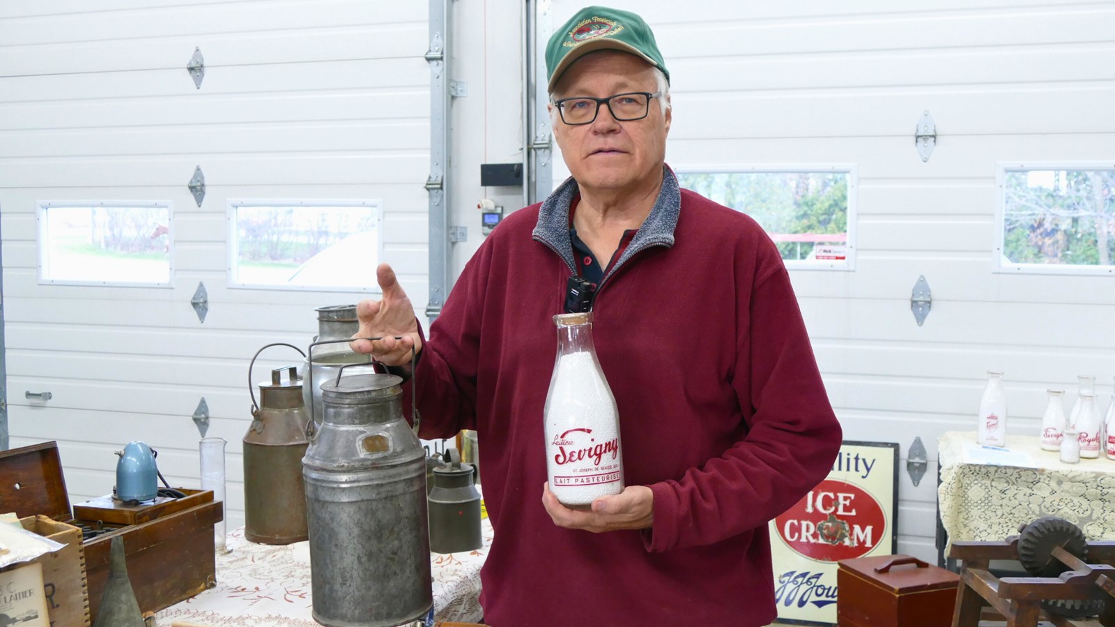 Devant une collection de pièces soigneusement rassemblées, il raconte comment l’industrie laitière a évolué au fil des décennies et illustre chaque étape avec des objets fascinants de sa collection.