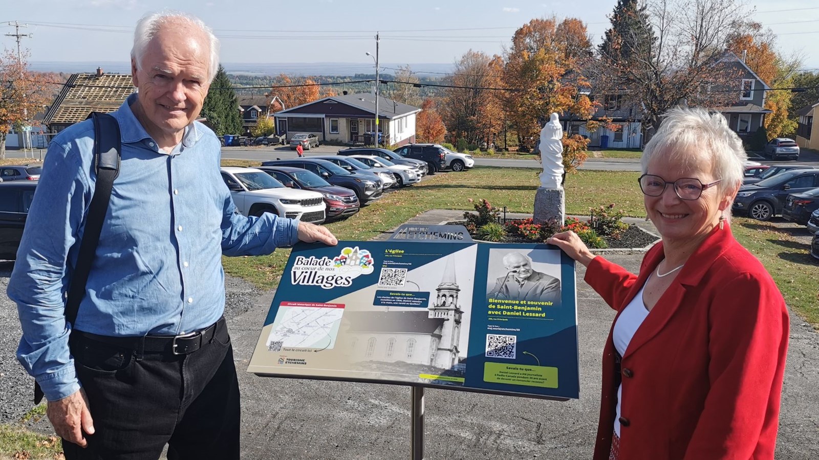 Une borne balado sur la vie de Daniel Lessard est également en fonction dans le village, tout juste en face de l'église. Pn voit l'illustre citoyen en compagnie de la mairesse, Céline Veilleux.