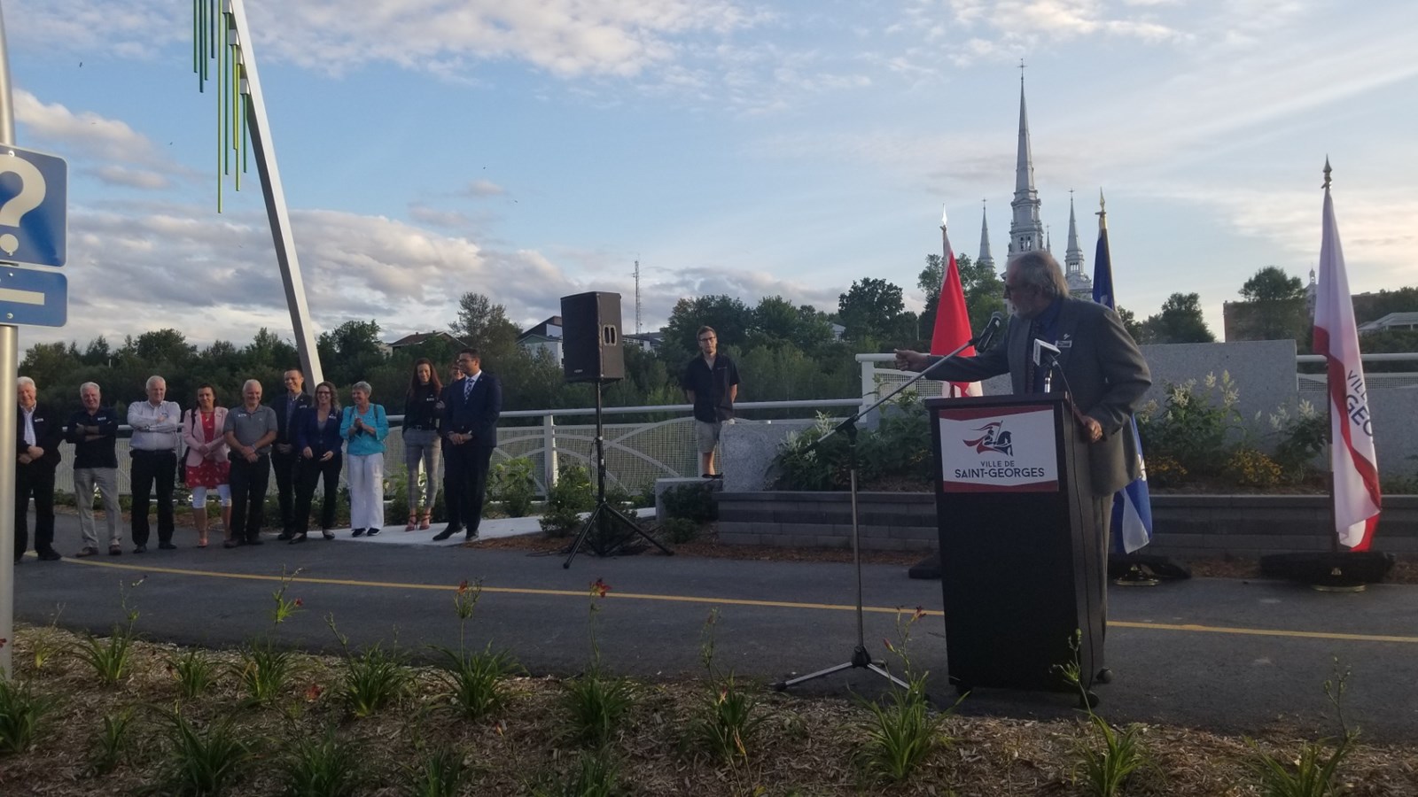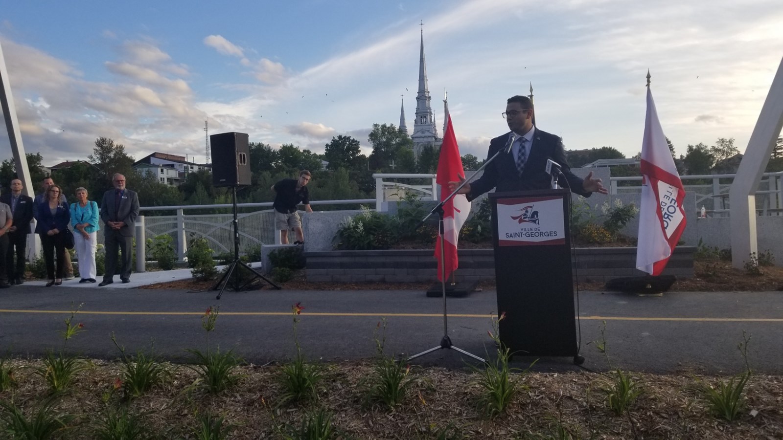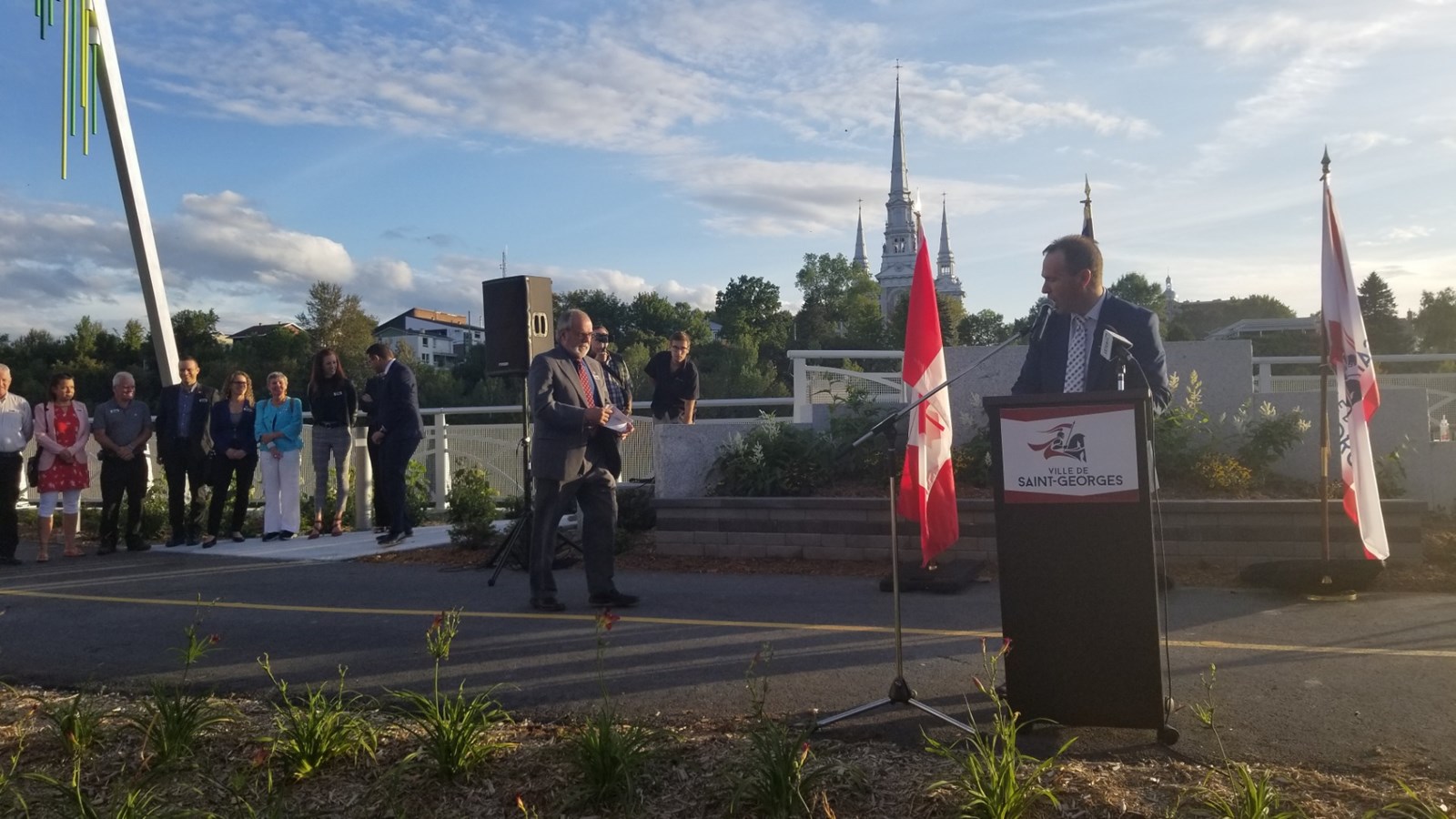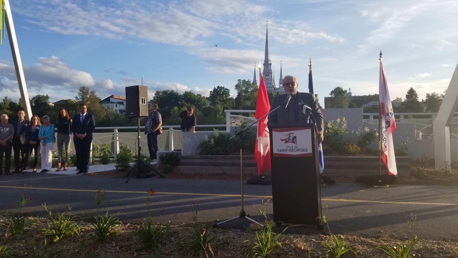 « Un centre-ville, c’est comme un cœur. Un cœur pour battre ça prend des artères qui sont bonnes. Alors, ce que l’on a fait ici avec toute la 1re Avenue et la promenade Redmond, on a fait une artère pour s’assurer que notre centre-ville demeure et soit une ville extraordinaire. Une ville sans centre-ville ne peut exister, » a déclaré le maire de Saint-Georges Claude Morin.