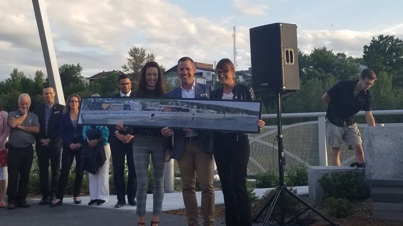 Le maire a pris le temps de remercier chacun des acteurs du projet et les commerçants de la 1re Avenue qui ont montré une grande patience. L’ingénieur et chef de projet, Alain Roy a été plus particulièrement remercié en recevant une photo panoramique du mur de soutènement. Par la suite, Claude Morin et Samuel Poulin ont procédé au dévoilement de la plaque de granite qui sera installée à même les pavées de la promenade. On peut y lire la devise de la ville « Ensemble pour l’avenir ».