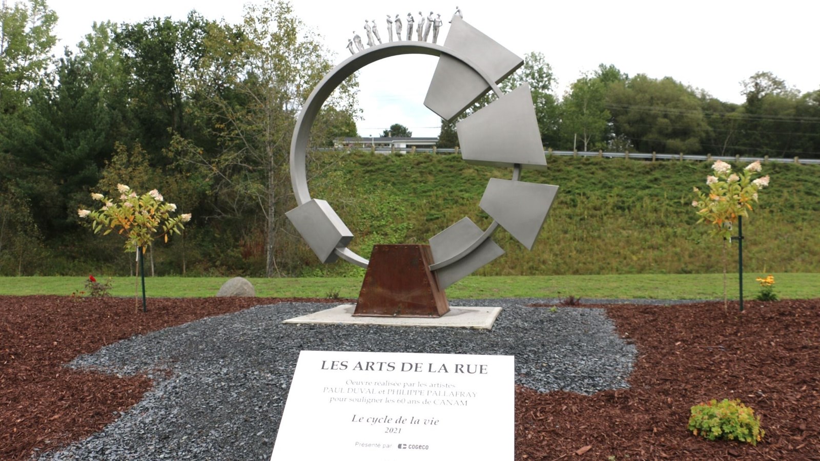 D’une hauteur de 10 pieds, l’oeuvre a été réalisée par les artistes Paul Duval et Philippe Pallafray. Intitulée Le cycle de la vie, elle célèbre les 60 ans du groupe Canam qui est un partenaire majeur pour la réalisation de cette sculpture en acier.