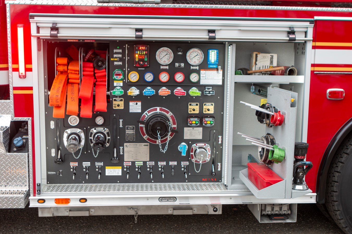 Aussi, des lances sont branchées à plusieurs endroits, en arrière et sur les côtés, pour plus d'efficacité sur le terrain et une intervention plus rapide. Ce qui en fait aussi un camion d'attaque.