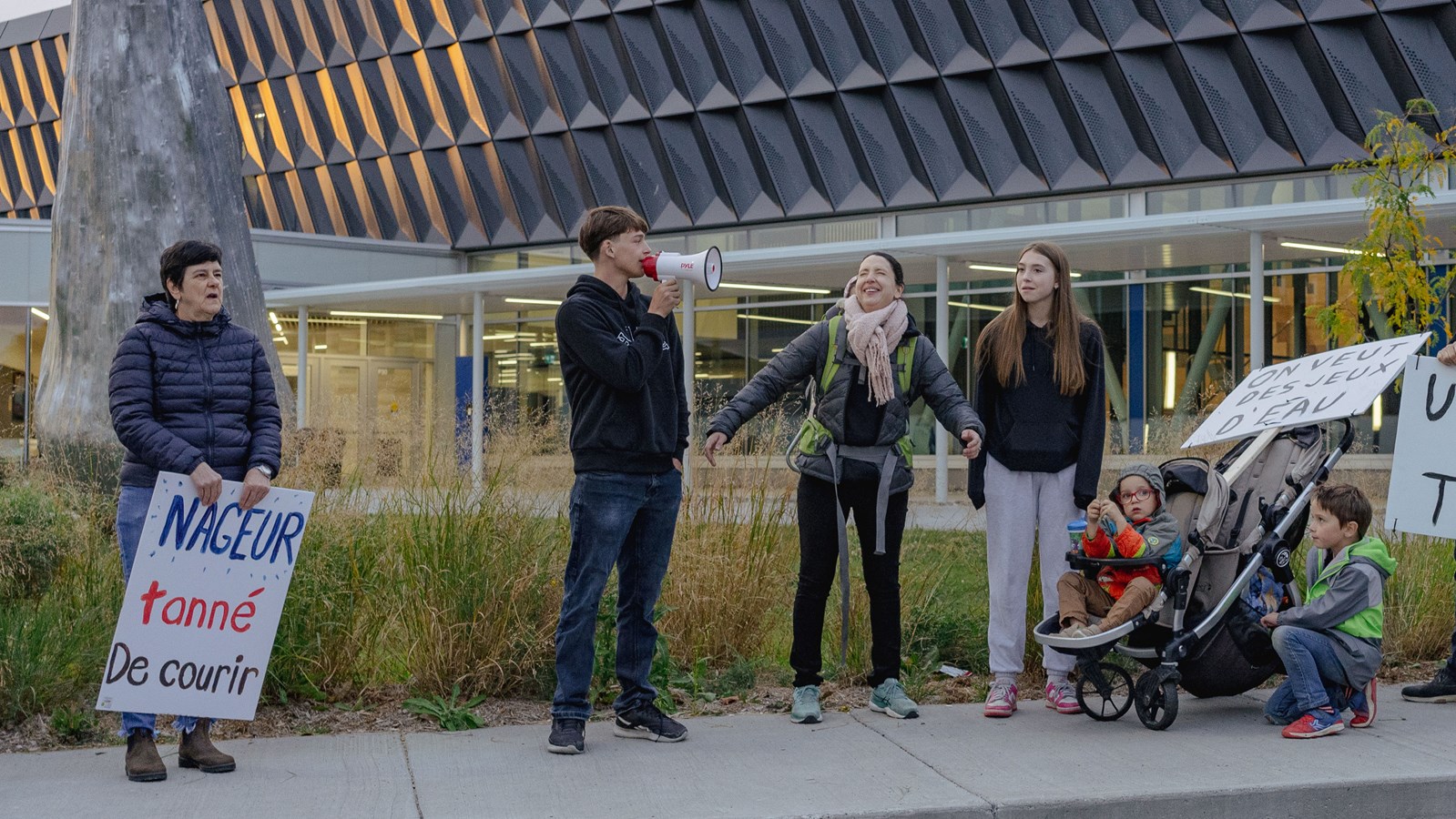 Organisé par Émile Soulières, jeune nageur du Club de Natation Régional de Beauce (CNRB), ce rassemblement avait pour objectif de demander à ce qu'un arbitrage soit mis en place dans ce conflit qui dure depuis six mois maintenant. Le cortège s’est donc rendu jusqu’à l’hôtel de ville où avait lieu le conseil municipal afin de se faire entendre.