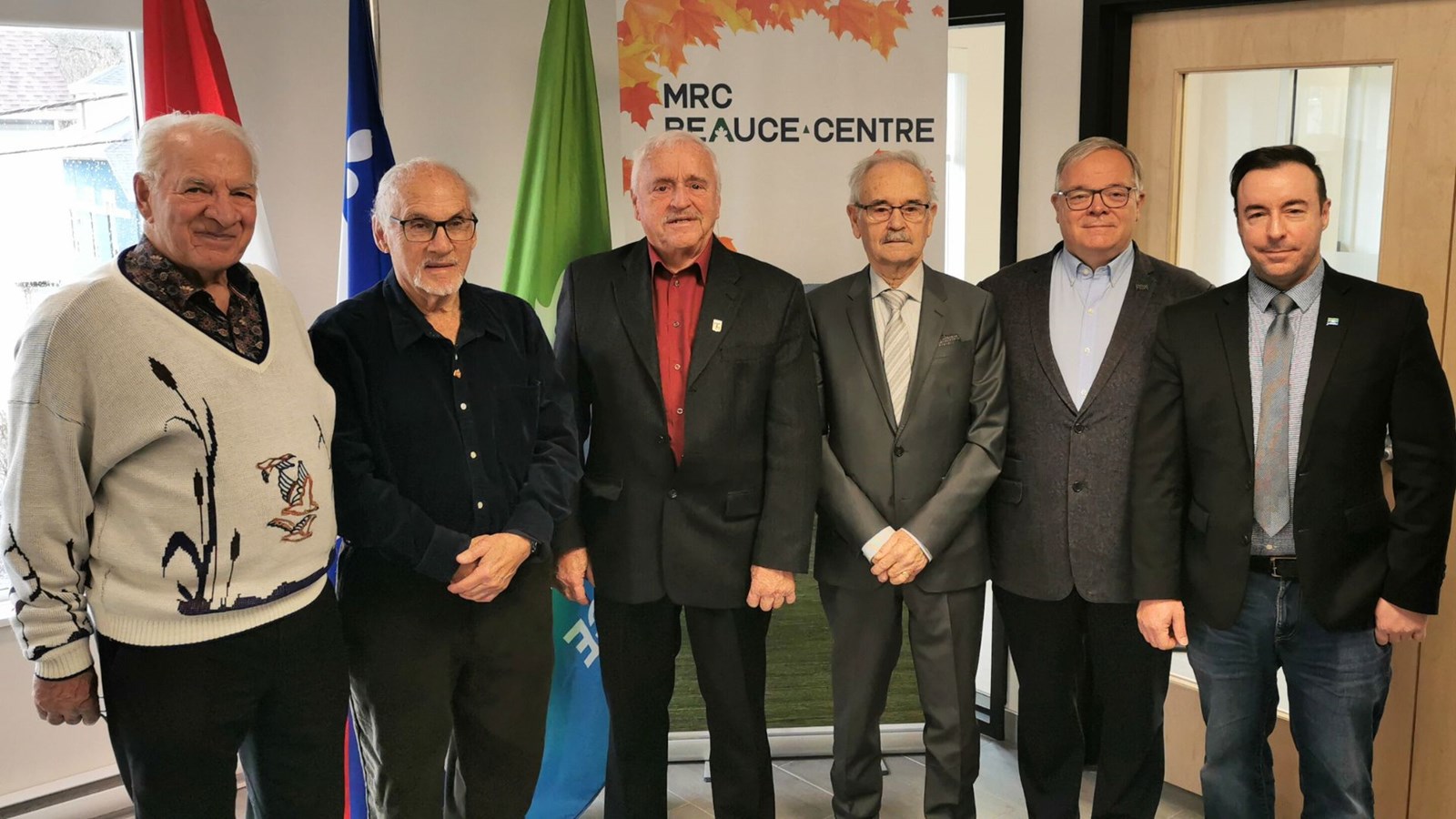 À l'extrême-droite, le préfet actuel, Jonathan V. Bolduc, en compagnie de ceux qui l'ont précédé dans la fonction, soit Gabriel Jacques, Marcel Veilleux, André Labbé, Jean-Rock Veilleux, et Luc Provençal.