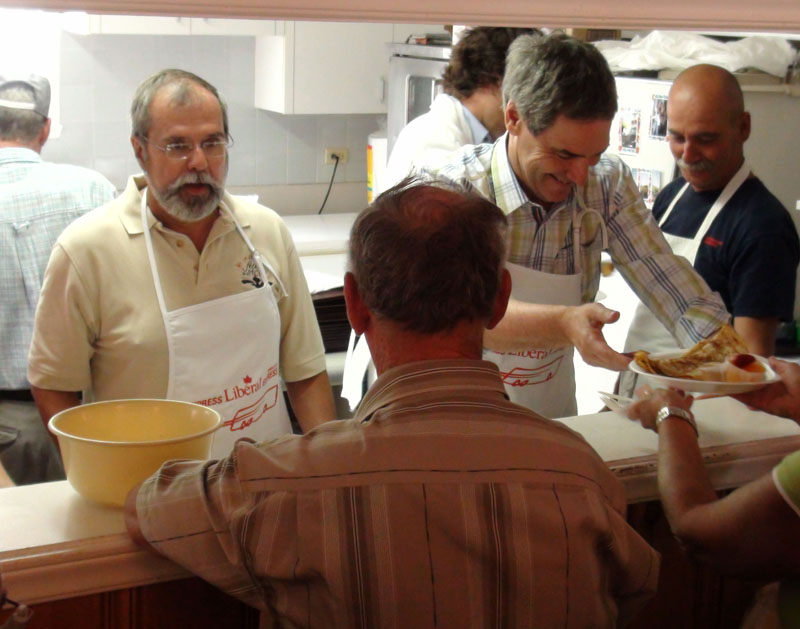 Claude Morin et Michael Ignatieff ont mis la main à la pâte afin de distribuer les assiettes de crêpes au déjeuner offert part le Parti libéral du Canada.