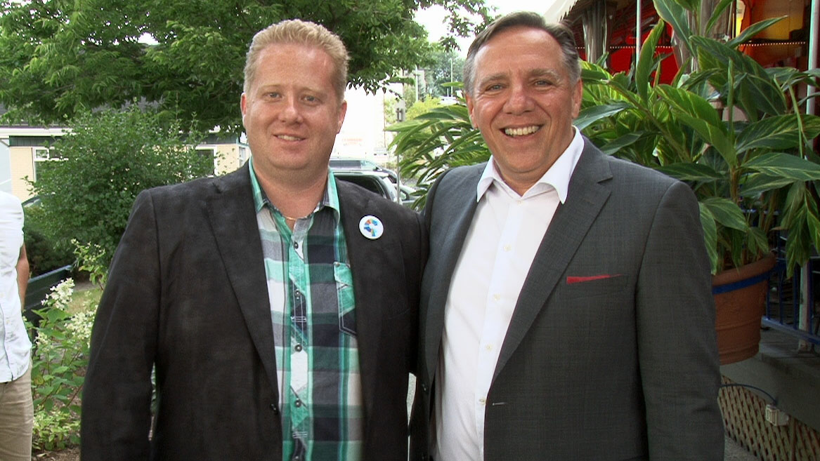 Le candidat caquiste de Beauce-Sud écoute attentivement son chef François Legault.