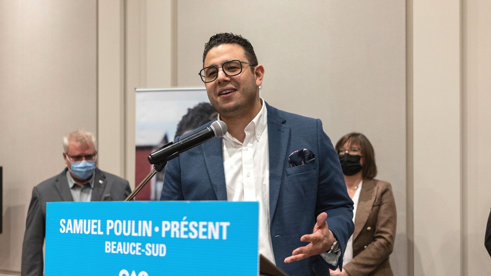 Le candidat de la Coalition Avenir Québec (CAQ) se présente avec le slogan « Samuel Poulin, Présent et tout un bilan. » En effet, ses projets autant pour la circonscription de Beauce-Sud que pour ses responsabilités à la jeunesse totalisent 600 M$.