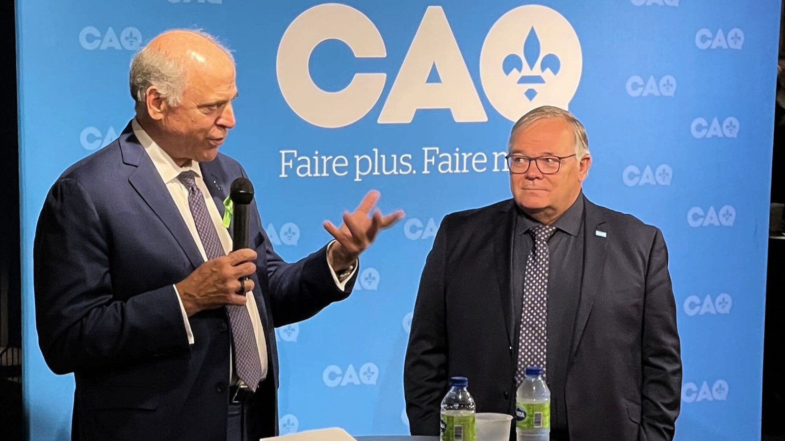 Le député de Beauce-Sud, Samuel Poulin, et le ministre de l'Économie, de l'Innovation et de l'Énergie, Pierre Fitzgibbon, en mai dernier, lors du dépôt de l'étude sur le marché de la vente au détail de l'essence au Québec.